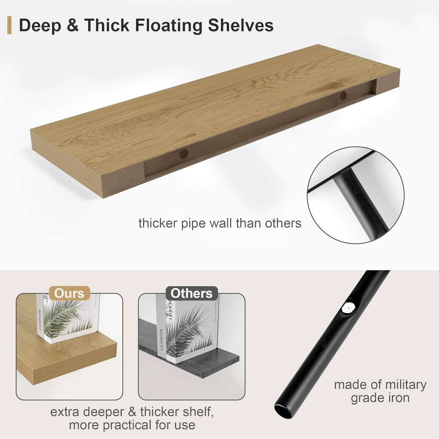 - NOTE:Slight color differences may occur due to lighting and screen settings.Our Well-designed floating shelves for wall are made of MDF Laminate. Slight color differences may occur due to lighting and screen settings.We use a natural wood grain veneer technique so that the veneer on each laminate is unique, so each board has a unique natural wood grain and colour.