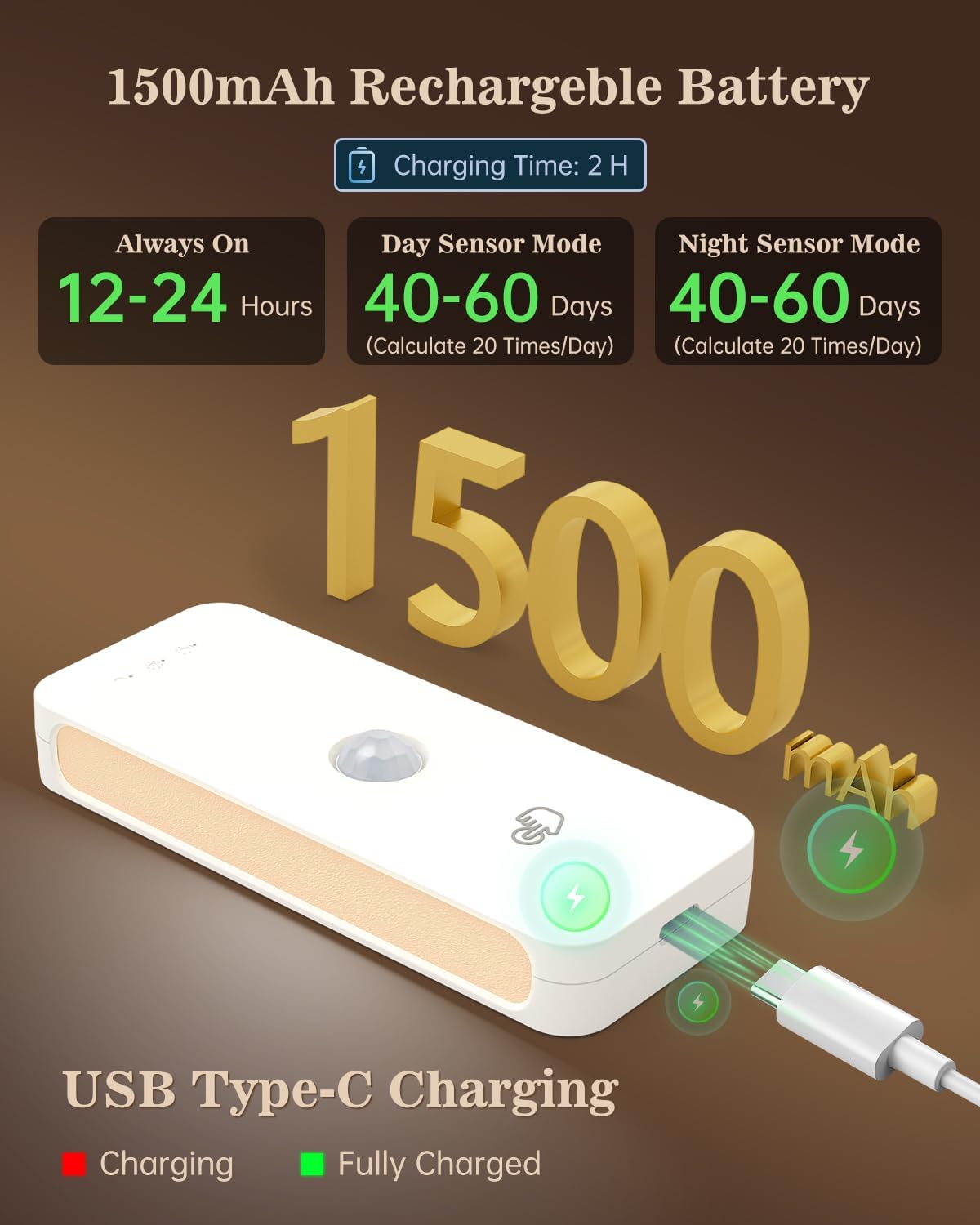- 【Rechargeable 1500mAh】Powered by a 1500mAh battery, this light lasts 12–24 hours in continuous mode or 40–60 days in motion-sensing mode. Charge 2/3 lights simultaneously via USB-C cable (included) in just 2 hours—convenient and energy-efficient!