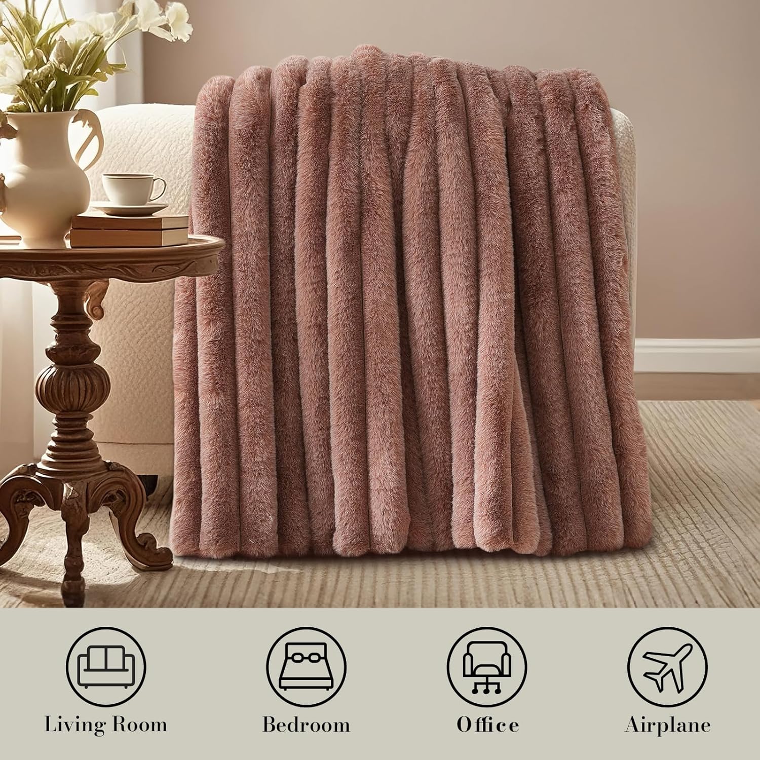 Amélie Home Faux Fur Throw Blanket for Couch, Ultra Cozy Fuzzy Fluffy Fur Luxurious Soft Striped Plush Gift Blankets for Family Sofa Chair Bed Living Room Bedroom, 60"x80", Ionic Fox Brown