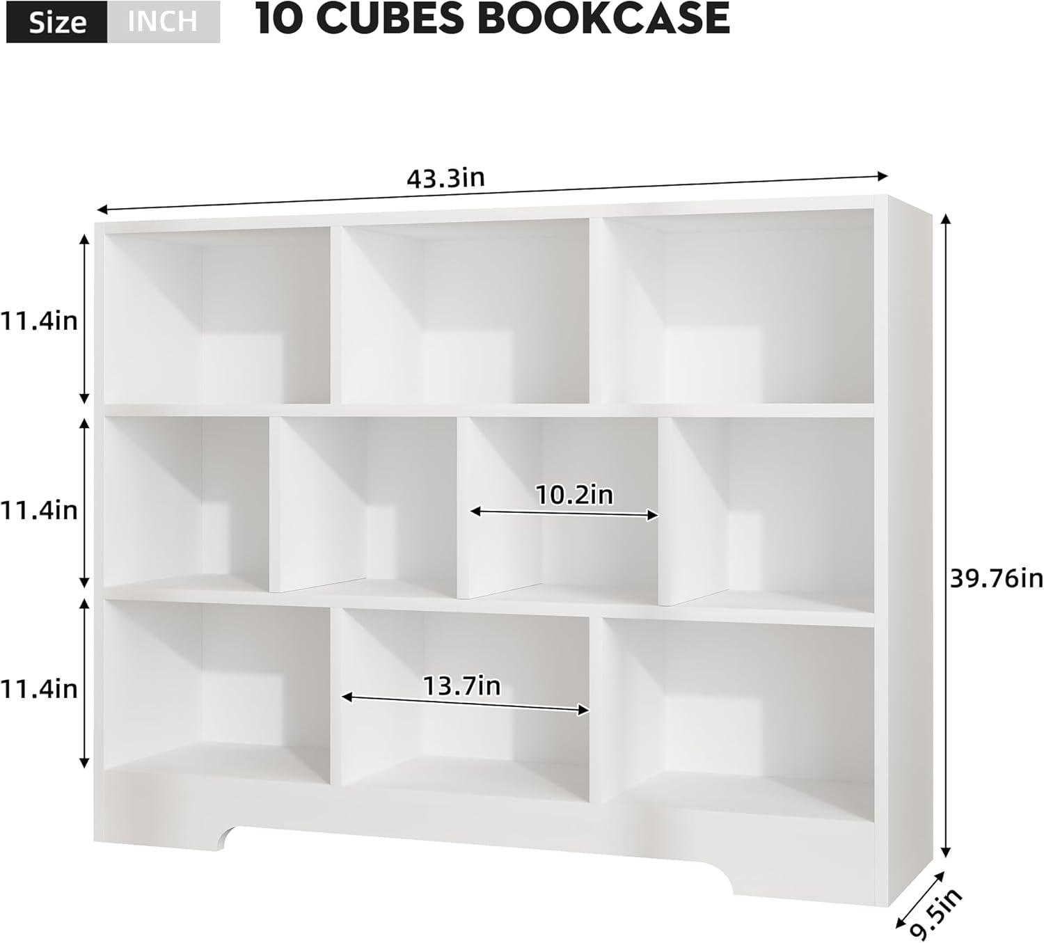 Book Shelf, 10 Cubes Storage Organizer, 3-Tier Open Shelf Wooden Bookcase, Freestanding White Bookshelf Cube Shelf for Bedroom, Living Room, Home Office
