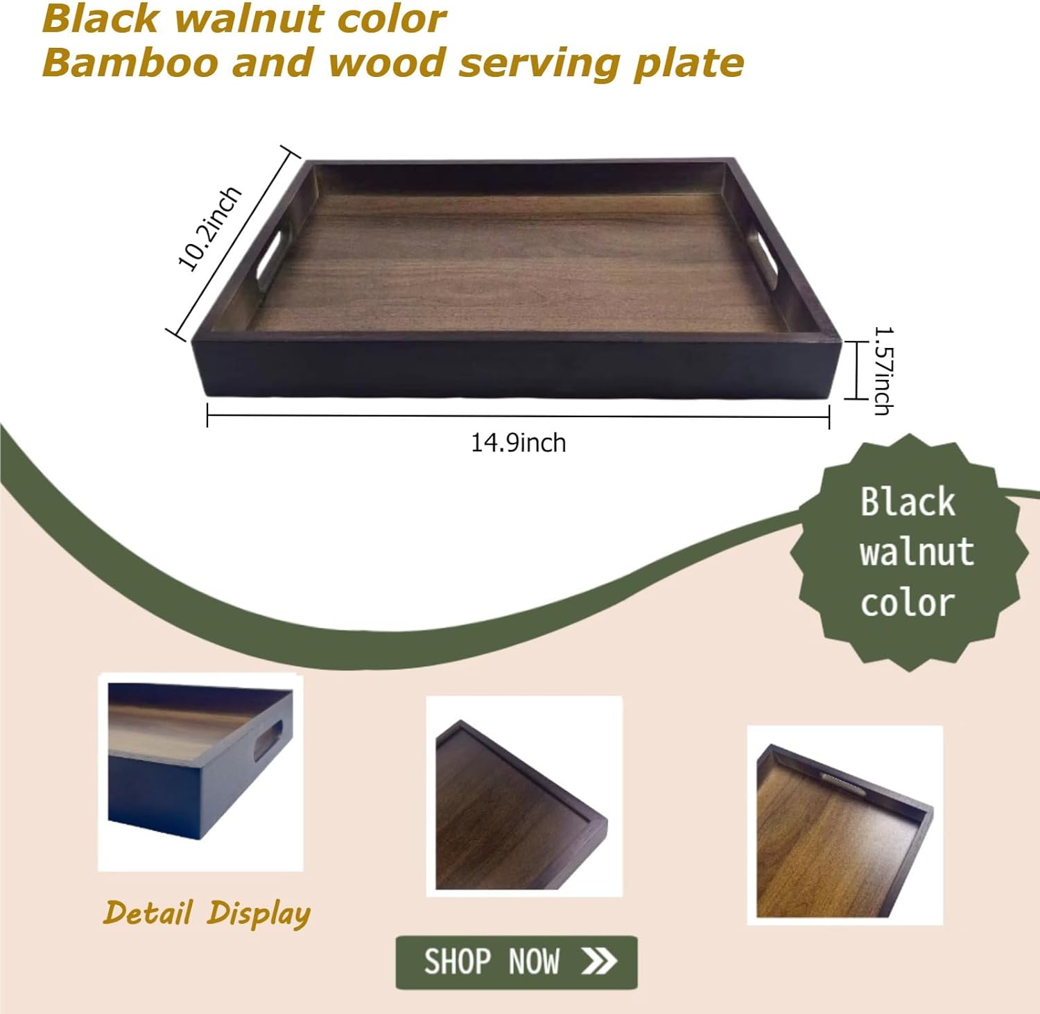 - Our bamboo and wood serving tray measures 14.9x10.2x1.57 inches, which can meet most of your usage scenarios. Believe it is your best life helper!