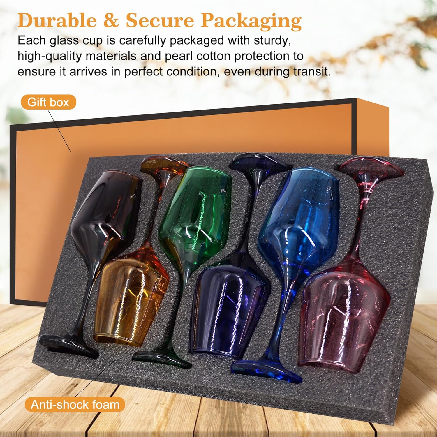 - ăElegant and Secure PackagingăGlazvia unique wine glasses is carefully packaged in an elegant and durable box to ensure safe delivery. The sturdy packaging protects the colorful glasses drinkware during shipping, so you can be confident they will arrive in perfect condition. Whether purchasing for personal use or as a wine glasses gift set, this thoughtful packaging adds an extra touch of sophistication, making the unique wine glasses set of 6 as an wine glass gifts for women.
