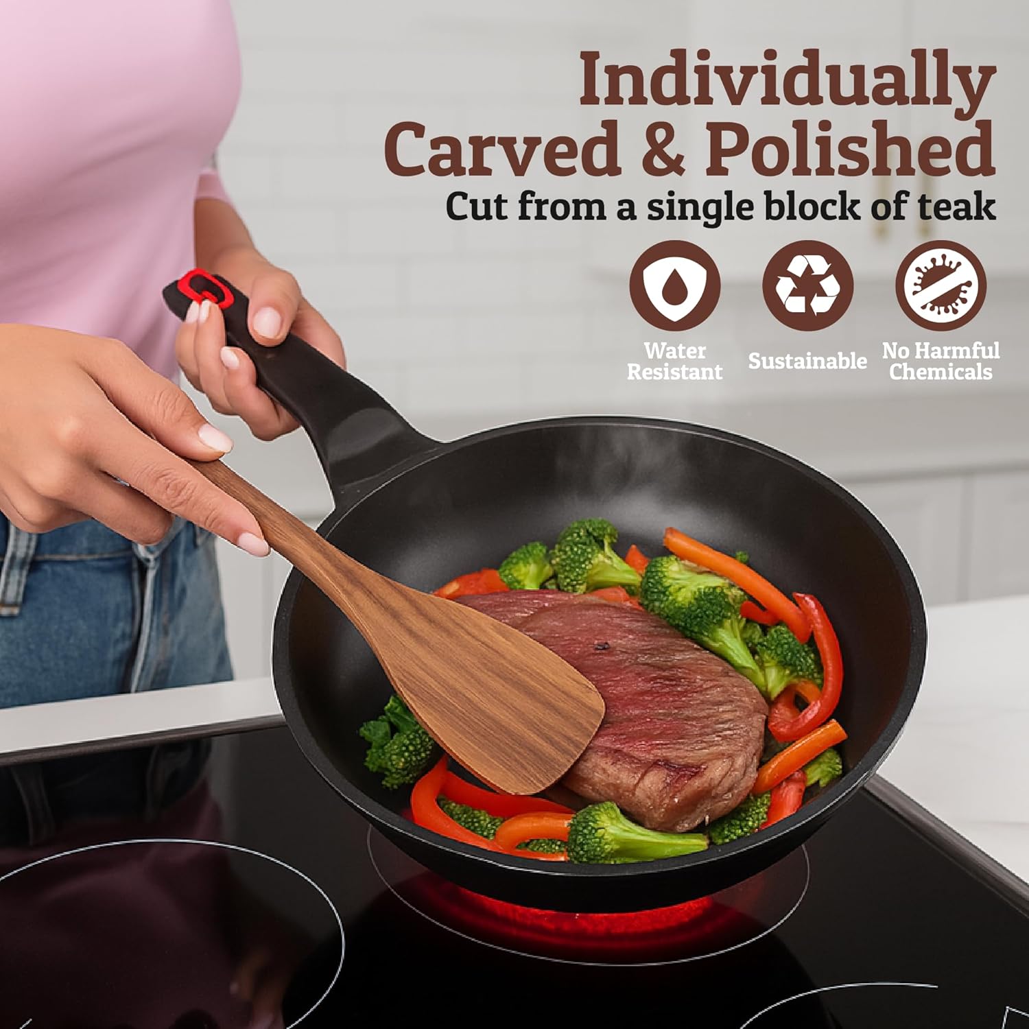 - Safe for Nonstick, Built for Everyday Cooking - These teak utensils are gentle on nonstick, ceramic, and cast iron cookware - no scratches, no damage. Use them to stir soups, flip pancakes, mix sauces, or serve dinner right at the table. Their heat-resistant handles and naturally rounded edges make them a go-to set for busy home cooks who want to protect their pans and enjoy cooking more.