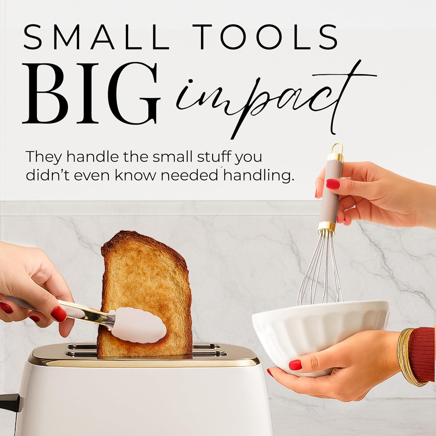- BEIGE AND GOLD, A STYLED STATEMENT: Elevate your gold kitchen decor with chic beige silicone and lustrous gold kitchen utensils. Designed to complement white and gold kitchen appliances and accessories, this gold utensils set doubles as functional art for your countertop.