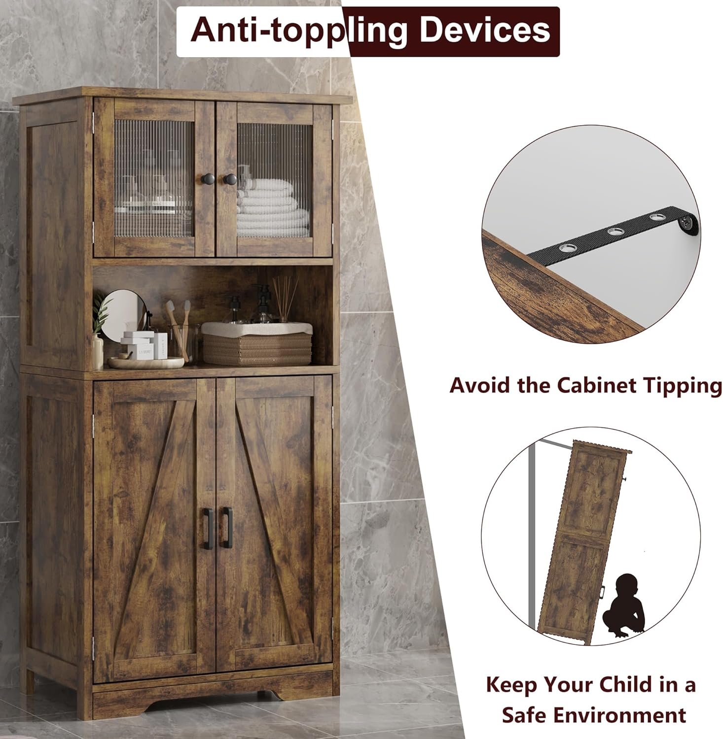 - Farmhouse Versatile Design: Enhance your home's aesthetic with this beautifully crafted bathroom storage cabinet. Featuring elegant glass doors and a charming farmhouse barn panel, it seamlessly complements any decor style, whether placed in the bathroom, living room, kitchen, or dining room