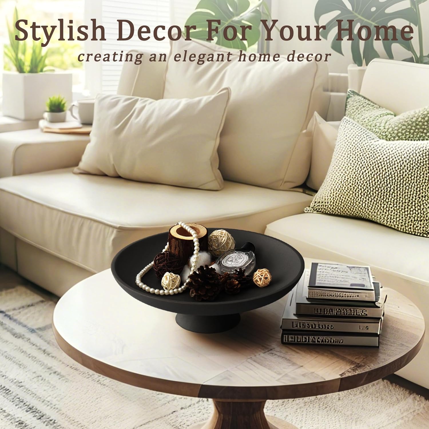 Modern Resin Pedestal Decorative Bowl, Large Fruit Bowl for Kitchen Counter, Stylish Key Bowl for Entryway Table, Matte Black