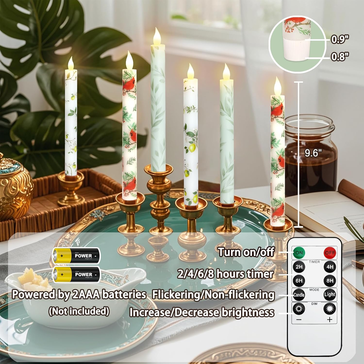 - Set Includes: Two willow leaf battery taper candles (requires 2AAA batteries, not included), a 10-button remote control, and instructions.