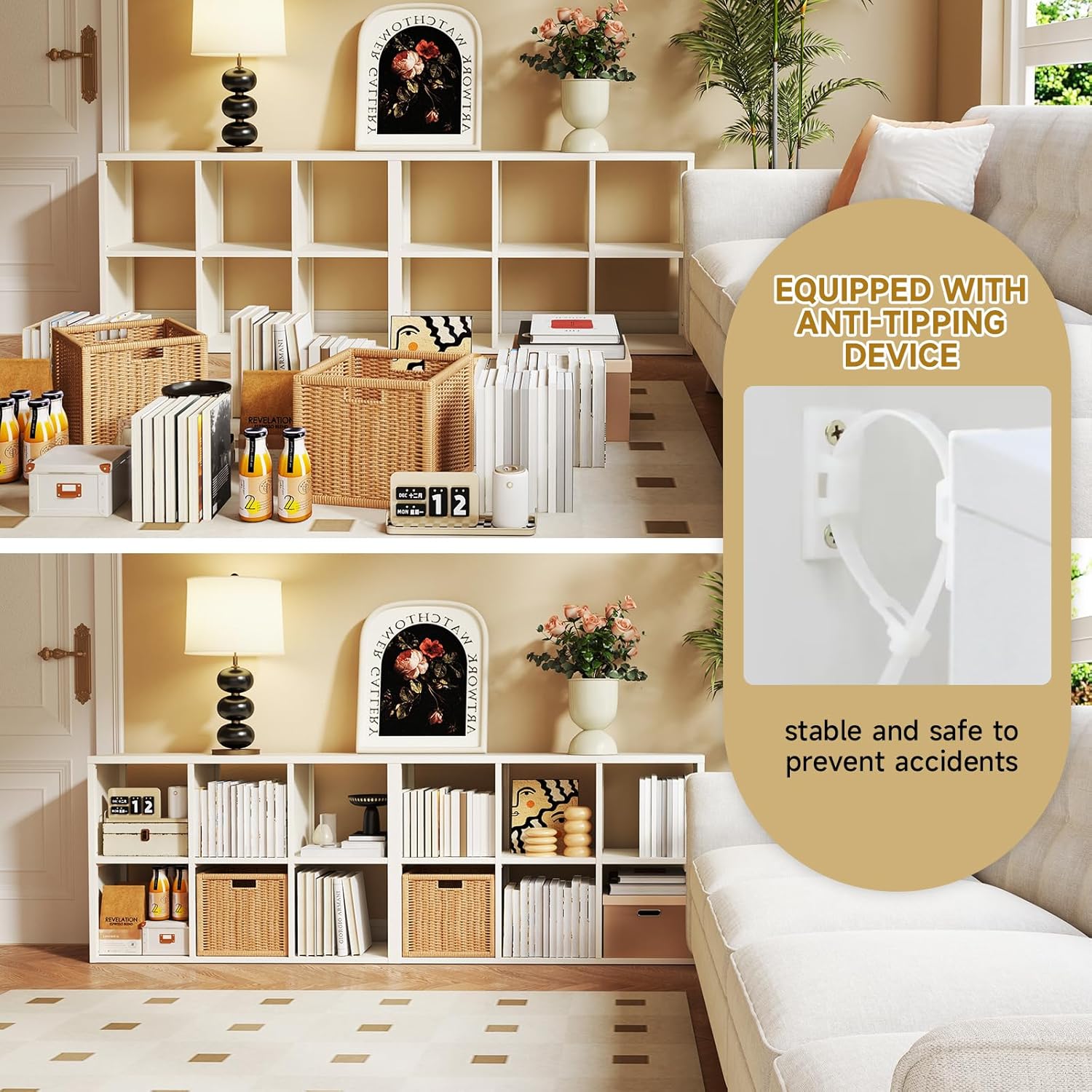 - Spacious Two-Tier Storage:11.8"D x 27.6"W x 27.6"H dimensions offer versatile storage across 2 tiers, fitting standard 11.8" bins. The wide top panel keeps essentials within easy reach, ideal for books, decor, kitchenware, or office supplies