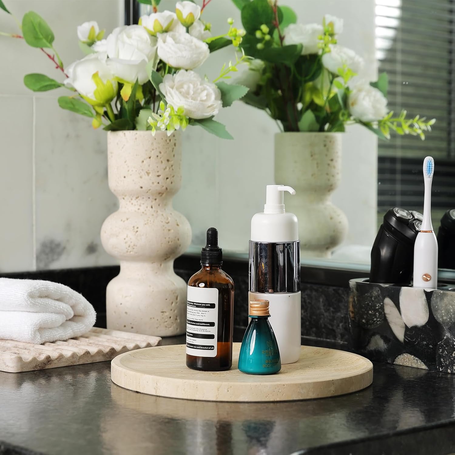 - Premium Natural Travertine Tray: Crafted from 100% natural travertine, this decorative tray adds timeless elegance to your bathroom, bedroom, living room, and kitchen. Ideal for enhancing home decor