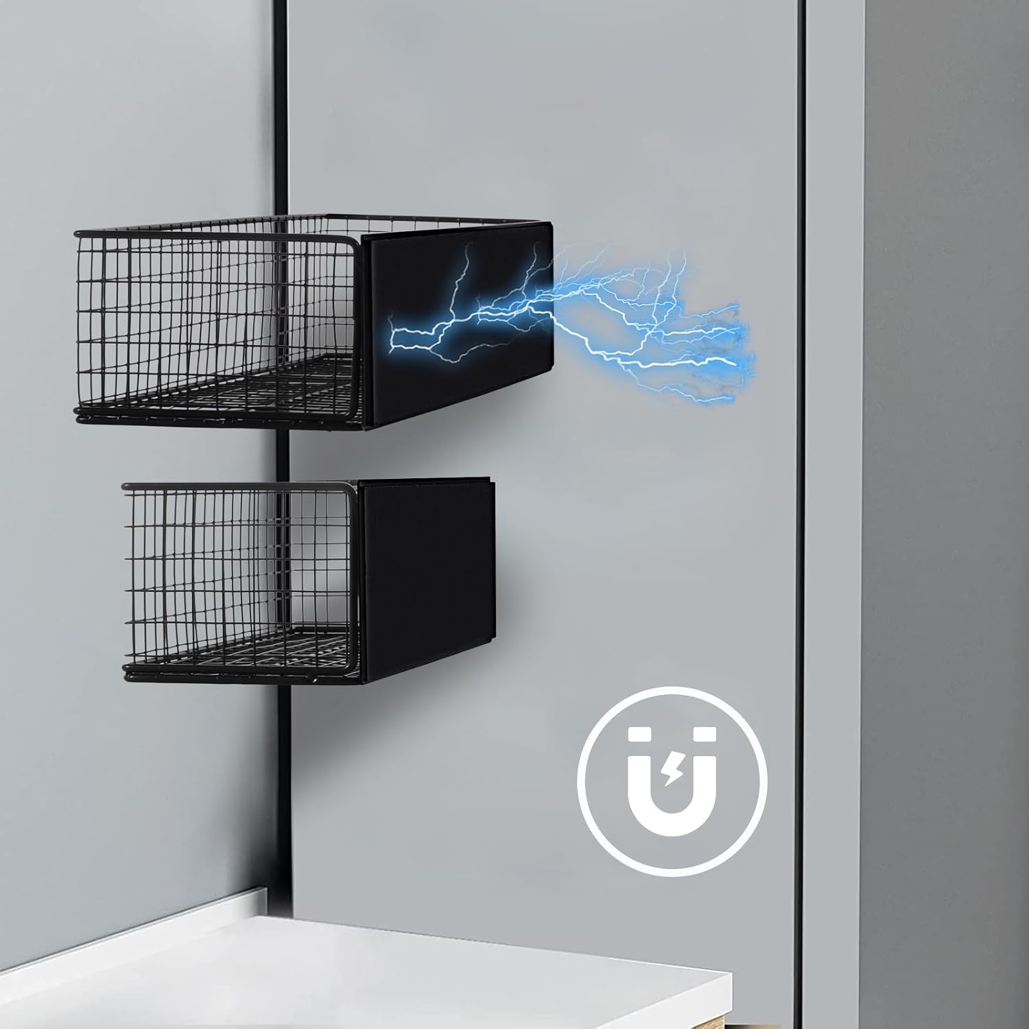 Magnetic Basket, Magnetic Shelf for Fridge,Magnetic Spice Rack Wire Mesh Magnetic Organizer Holder Accessories for Office Kitchen Classroom Storage, Black-High, Large x1&Small x1 Set of 2
