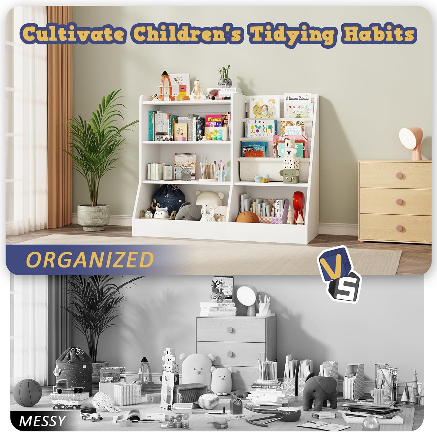 - Larger Size & Stable Structure --- Dimensions: 39.3"W x 15.7"D x 31.5"H, this bookshelf for kids is larger in size, providing more storage space for more book supplies and toys for kids of all ages.This bookhelf with storage has precise hole matching, complete required accessories and comes with installation instructions, which makes the installation easier, easier to assemble and more stable structure.