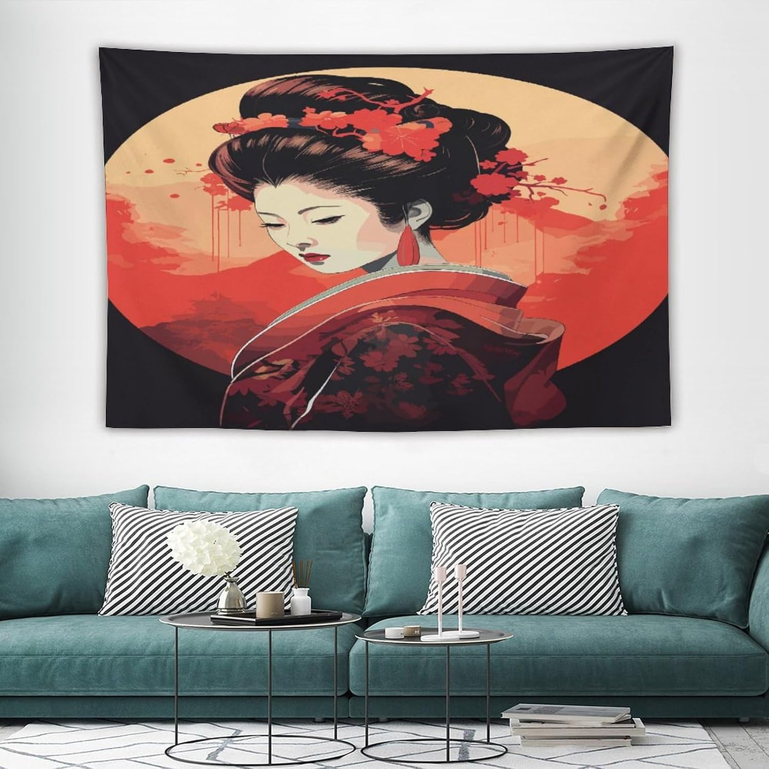 Japanese Woman Geisha Tapestry Asian Cherry Blossom Red Sun Traditional Kimono Folk Tapestries Home Decor for Living Room Bedroom Apartment Farmhouse Dorm 90"x60"