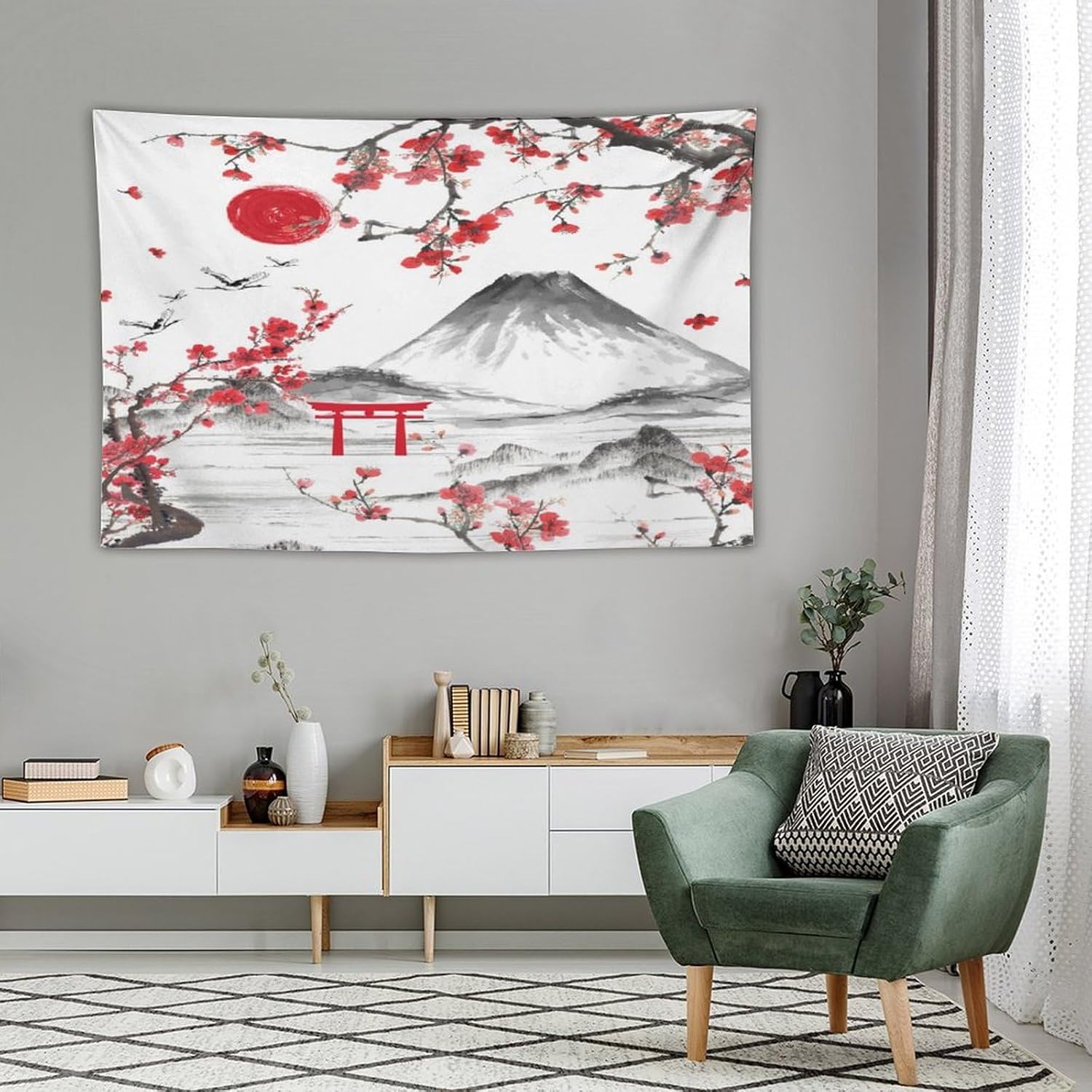 Red Cherry Blossoms Tapestry, Japanese Fuji Mountain Tapestry, Asian Japanese Wall Tapestry, Nature Landscape Tapestries for Bedroom Living Room Decor 60"x40"