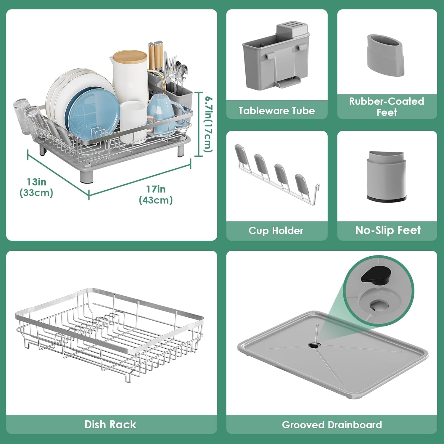MOUKABAL Dish Drying Rack - Stainless Steel Dish Rack, Dish Racks for Kitchen Counter, Drying Rack Kitchen with Removable Utensil Holder, Drainboard and Glass Organizer (Grey)