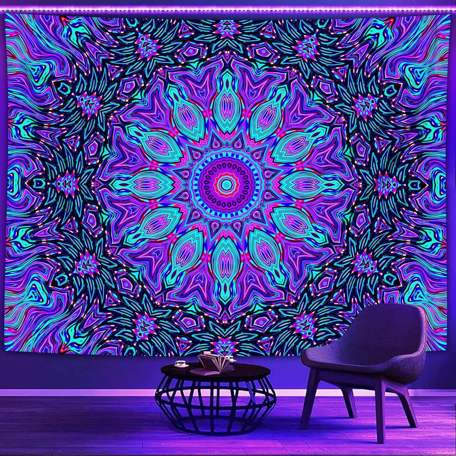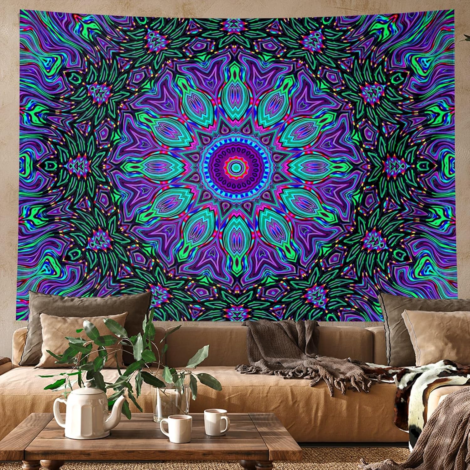 PSYHILAR Blacklight Mandala Tapestry for Bedroom, Psychedelic Black Light Posters for Adults and Teens, Neon UV Reactive Aesthetic Bohemian Art Wall Hanging Decor (80 x 60 Inches)