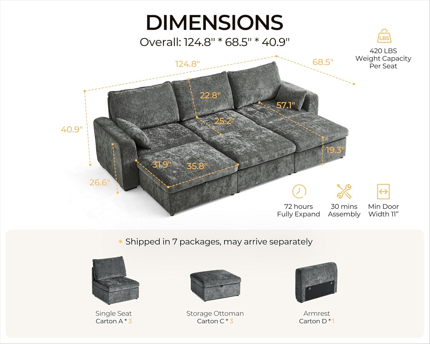 - ăMultiple Packages & Dedicated Supportă Your cloud modular sectional couch ships in 7 separate packages, which may arrive at different times. If you receive only some boxes, donât worryâmore are on the way! Need additional tracking details or assistance? Weâre happy to helpâjust reach out! Our team is here to ensure you receive everything as expected and guarantee a smooth, hassle-free shopping experience with your complete satisfaction