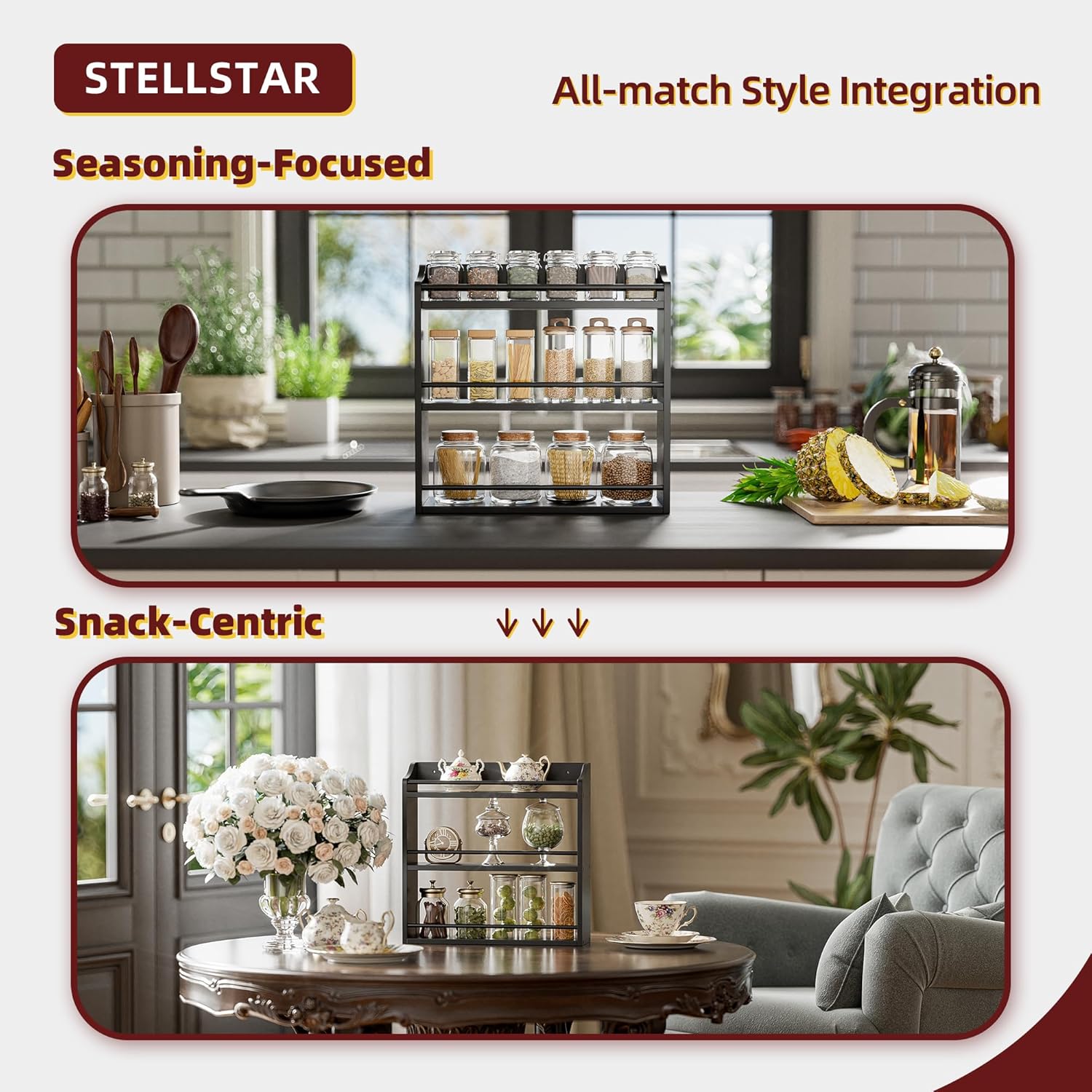 - SIMPLE, ELEGANT & VERSATILE: This rack is both a stunner and a workhorse. Its minimalist design oozes elegance, blending seamlessly with any decor to add warmth. But it’s more than a spice rack! Use it to organize your coffee bar, declutter your bathroom, or neatly stack snacks in mason jars. Wherever you place it—kitchen, pantry, bathroom—it transforms chaos into a tidy, stylish space