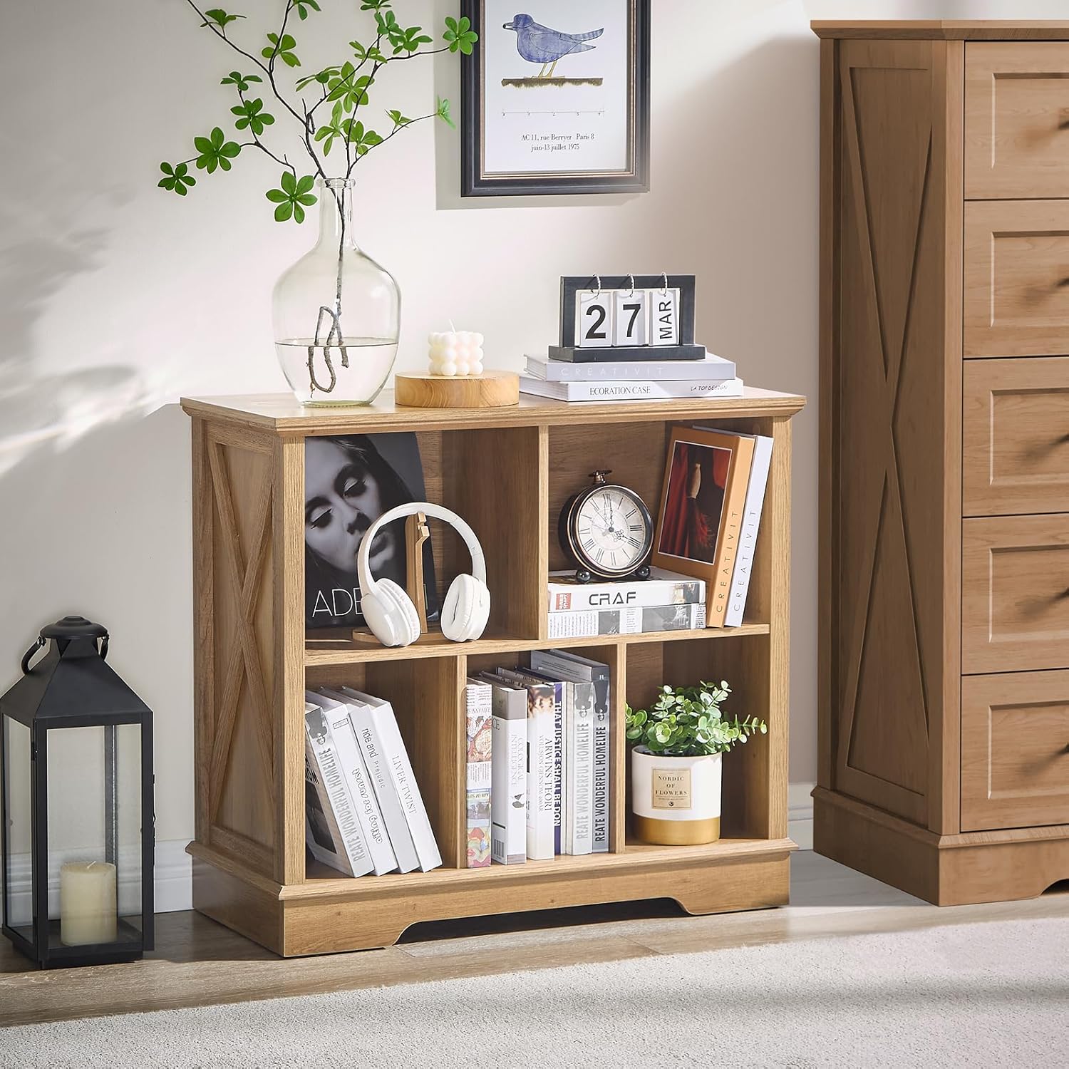Farmhouse 5 Cube Bookshelf, Storage Organizer Bookcase, Kids Toy Storage Cabinet, Small Bookshelves Storage Organizer Shelf, Wood Display Cabinet Book Shelves for Bedroom,Living Room,Natural Oak