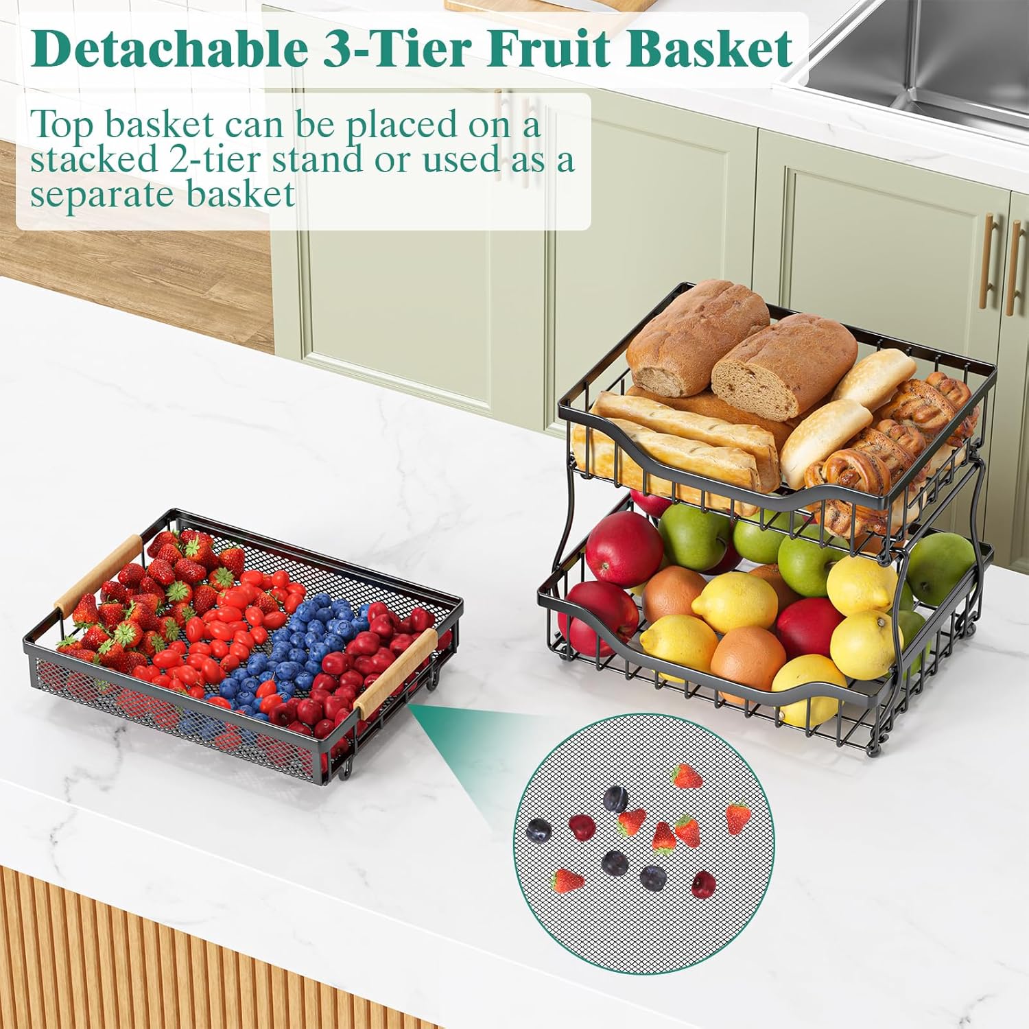 Giwil 3 Tier Countertop Fruit Mesh Basket for Kitchen, Vegetable Storage Bread Fruit Bowl Stand with 2 Banana Hooks, Wall Mounted Metal Wire Basket Organizer for Potato Onion, Black