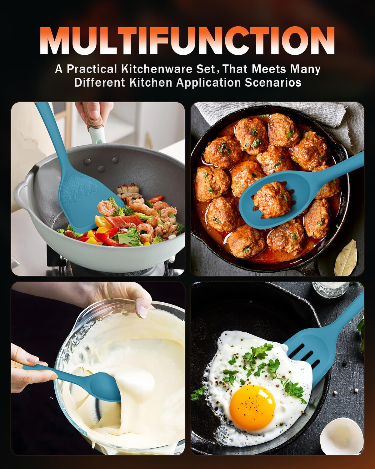 Silicone Cooking Utensils Set, Perfectly Angled for Frying, Mixing,Serving,Draining,Turning and Stirring, BPA-Free Matte Silicone, Wood Handles, Safe for Nonstick Cooking Surfaces,4 Pack (Blue)