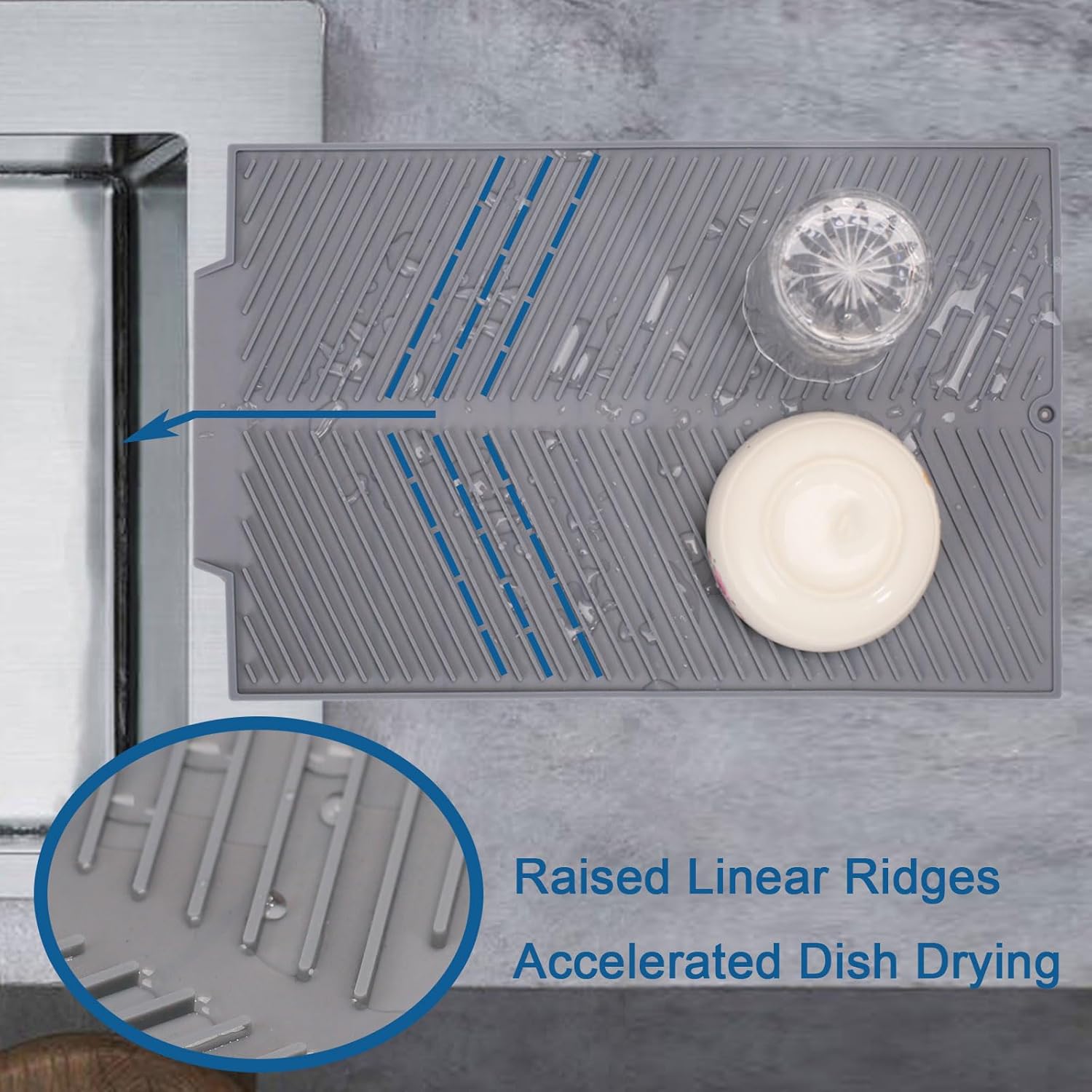 - DISH DRYING MAT: 15" x 10" size gives enough room to air-dry washed dishes. The raised design helps air flow under dishes, with diagonal ridges drawing away moisture and a drainage lip directing water into the sink for dry countertops.