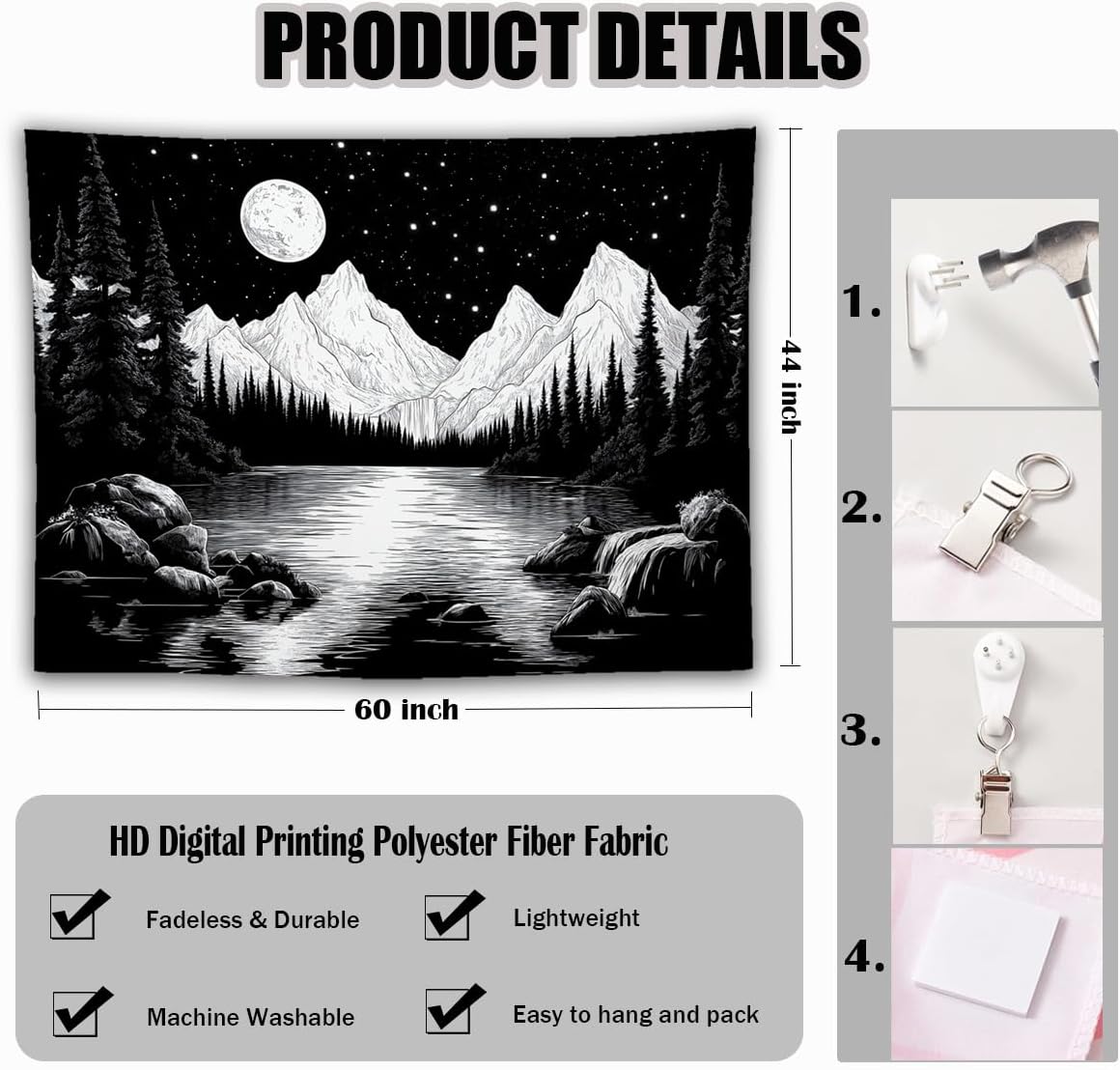 - Premium Craftsmanship: Made from skin-friendly, durable polyester fabric, this tapestry is soft to the touch and easy to clean. The high-definition printing technology ensures that the intricate details of the mountains, moon, stars, and lake are vivid and long-lasting