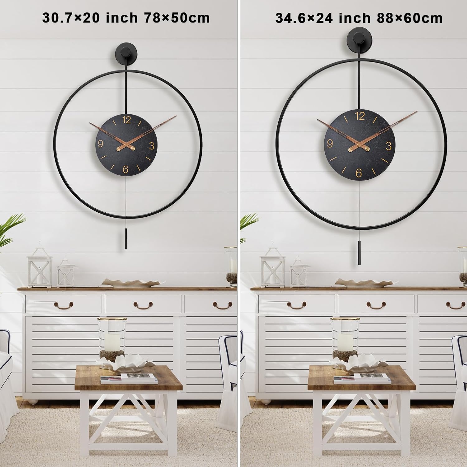 - 【What You Receive】Pytha Sight provide a 30.7×20 Inch (78×50 cm) large modern decorative pendulum wall clocks for living room,hook,a free pair of vintage gold pointers and professional customer service.If the arabic numeral pendulum wall clock does not work, please find us anytime.