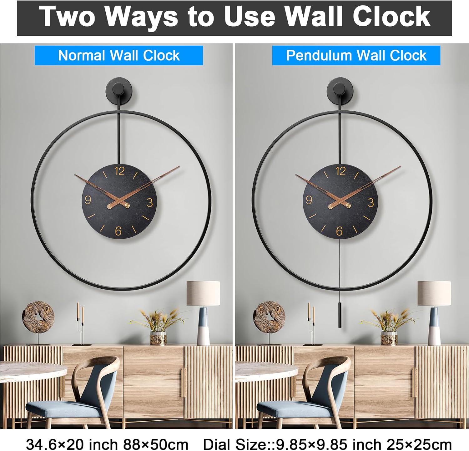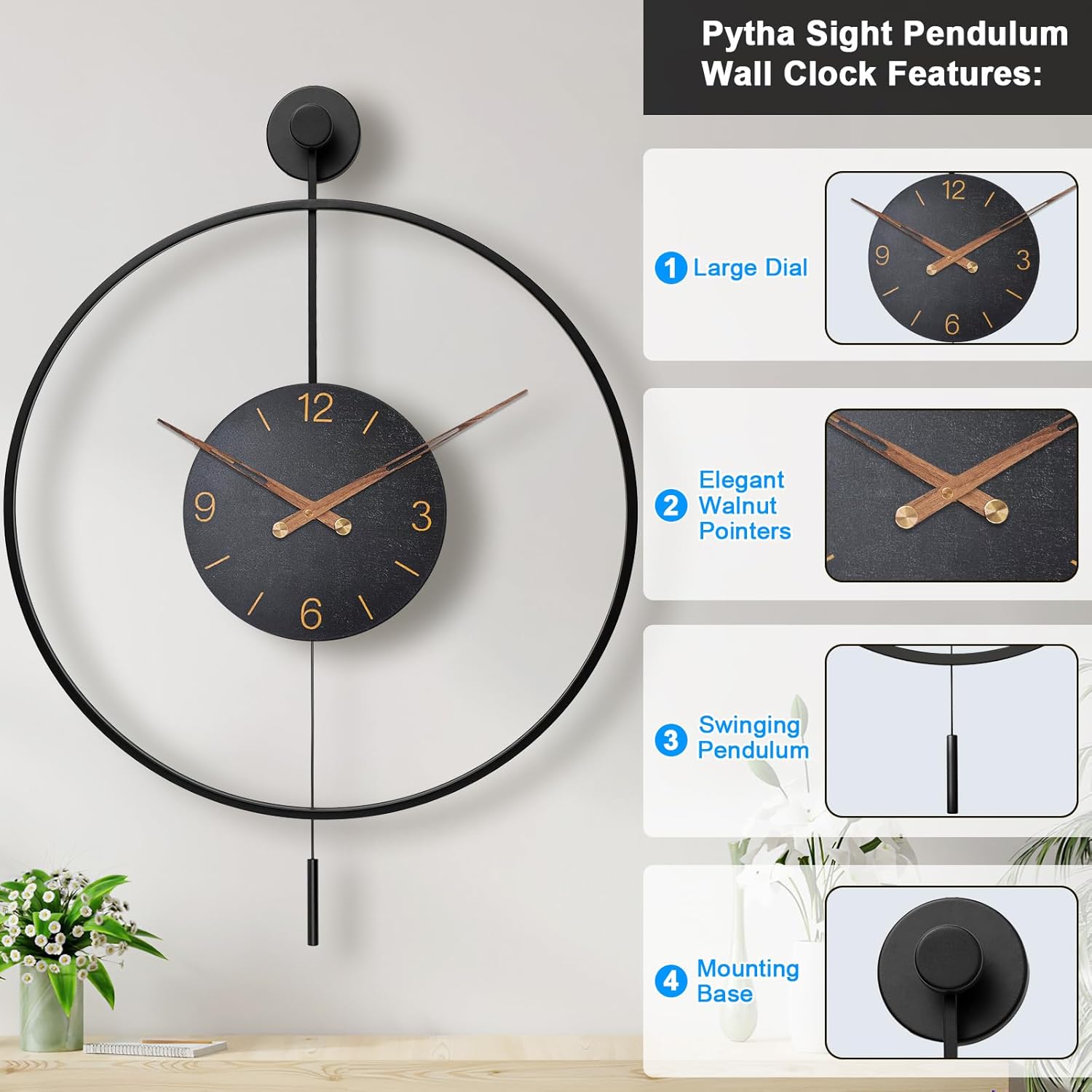 - 【Hand-Craftsmanship】Crafted with attention to detail,the large minimalist modern decorative wall clock exhibits quality craftsmanship. Pytha Sight metal construction feels sturdy and durable.Our big pendulum wall clock overall build exudes a sense of quality,making it a lasting addition to the home decor.