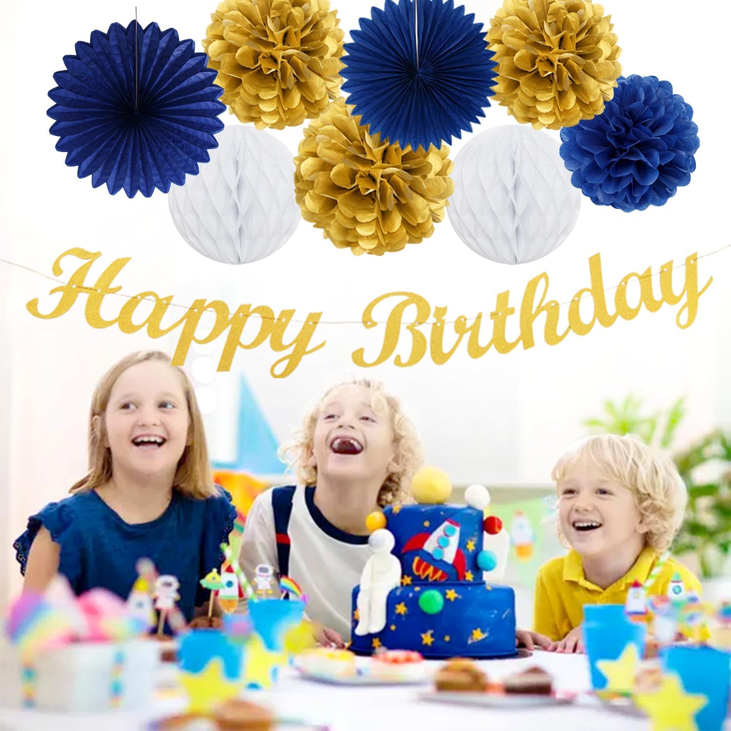 - 【Navy blue gold birthday decorations kit includes】The party decorations kits include 8pcs navy gold white paper flower, 2pcs royal paper fans,2pcs 8" white paper Honeycomb, happy birthday garland and navy blue gold white streamers.