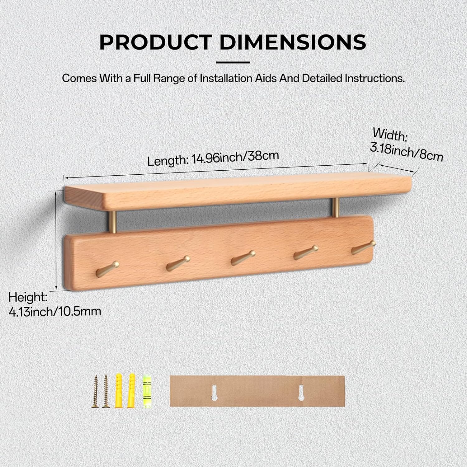 Shelf with Hooks, Solid Wood Bedroom Shelves for Wall, Wooden Coat Rack Wall Mount for Bathroom, Kitchen, Door Entryway (Beech, 38cm/14.96inch)