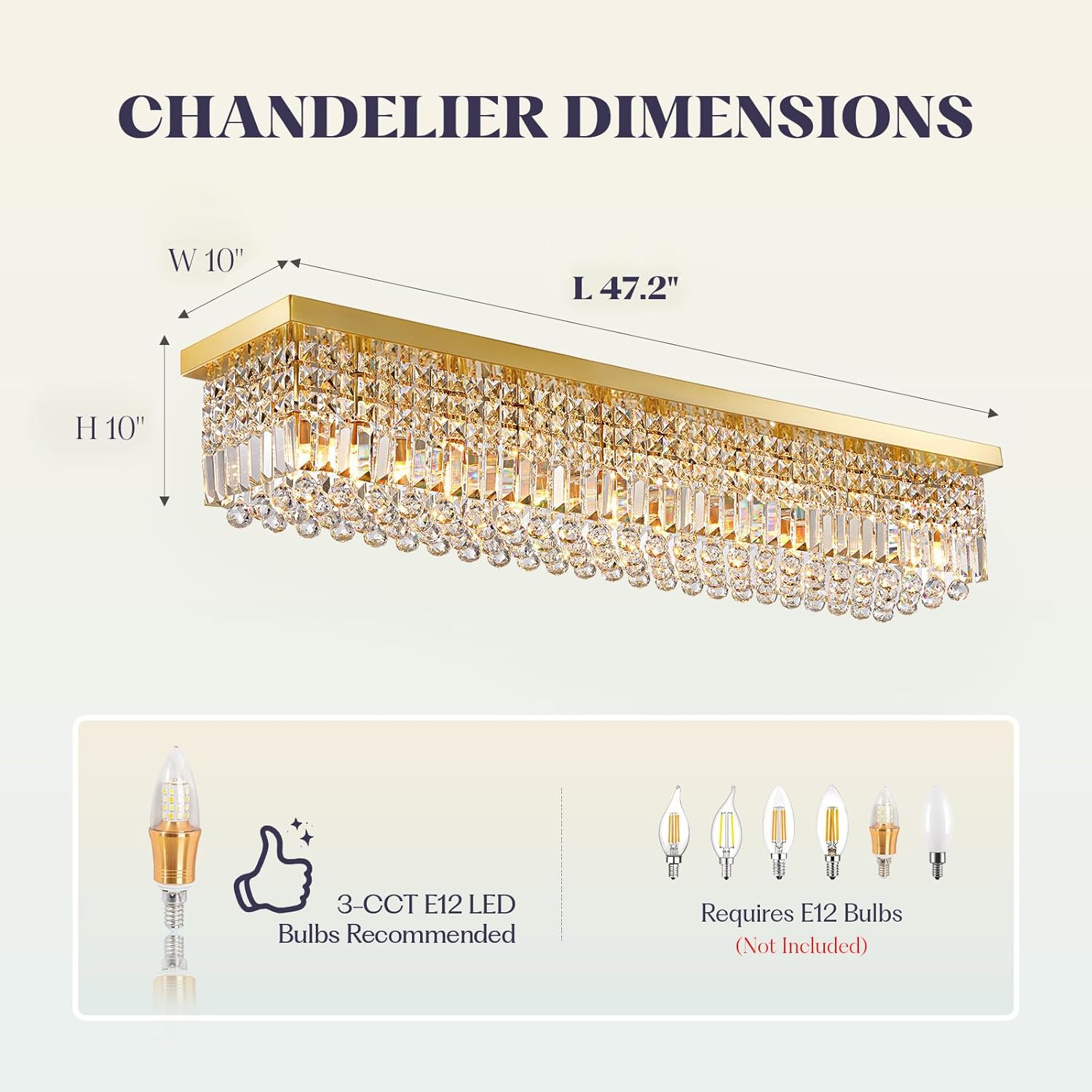 - BULB REQUIREMENTS: 10 E12 bulbs are required for the rectangular crystal chandelier (max power 40W, not included). Compatible with a variety of E12 bulbs such as incandescent, fluorescent, CFL, halogen. You can use dimmable bulbs and dimmer switch (not included) to change the light color and brightness of the rectangle dining room light fixture