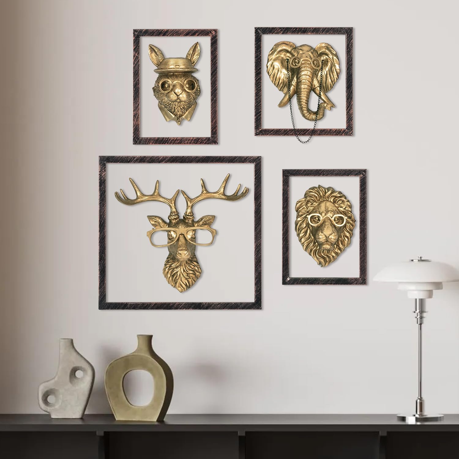 HUYIENO 4PK Animal Head Wall Decor with Metal Frame Flower Vase Gold Handcrafted Hanging Home Decor Sculptures for Living Room Bedroom