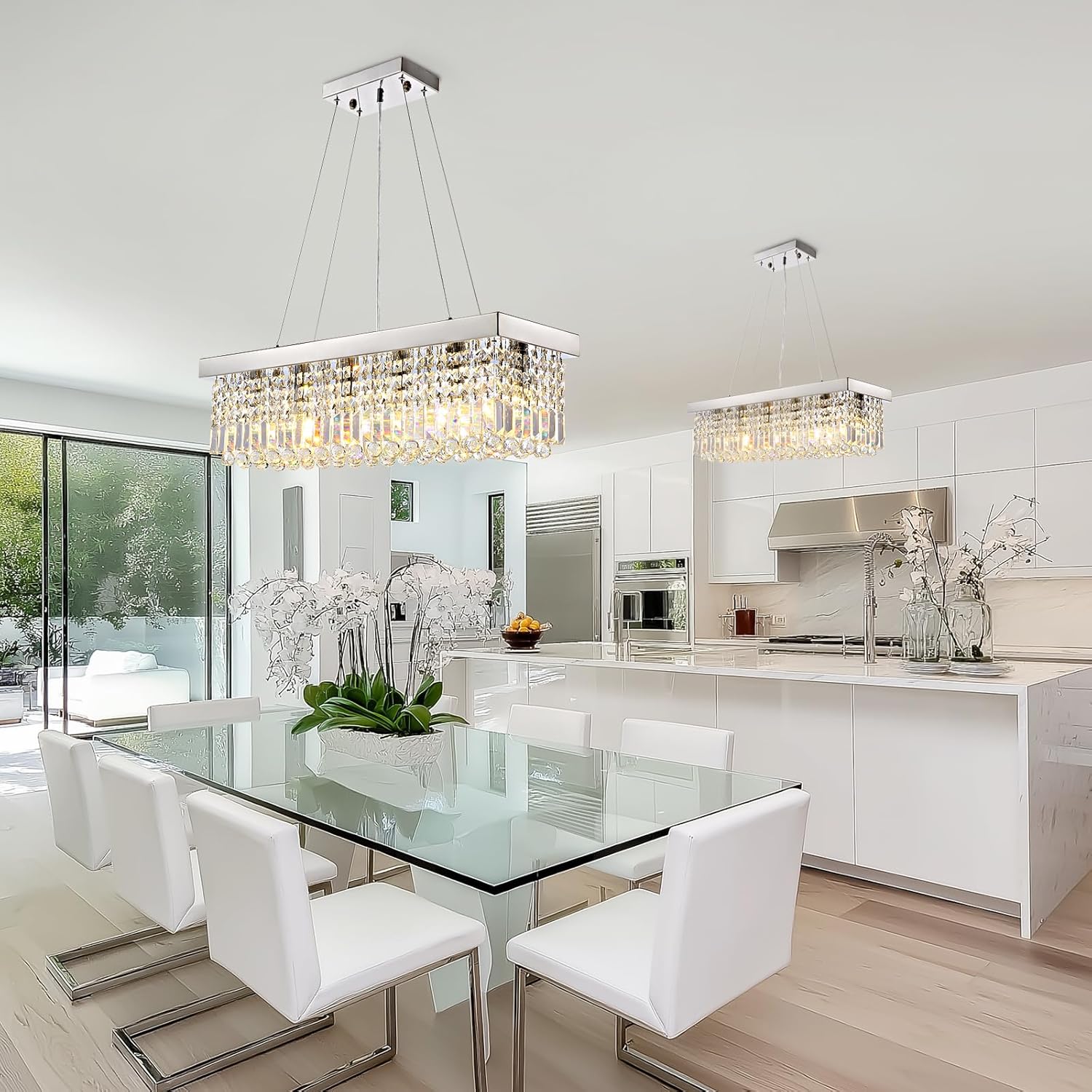 - MODERN & VERSATILE DESIGN: This modern crystal chandelier fuses sleek contemporary style with the timeless glamour of a raindrop chandelier, creating a sophisticated ambiance in any room. Whether as a crystal chandelier for dining room gatherings or a dazzling focal point in your living room, it adds sparkle and style โ truly one of the most eye-catching kitchen crystal chrome chandelier light fixtures for your home.