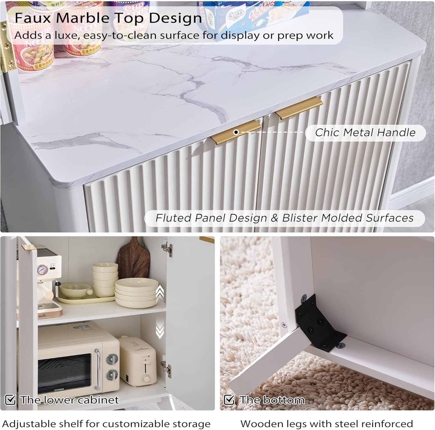 - ăSleek Wave-Like Design & Premium MaterialsăElevate your space with OKDâs iconic wave-fluted doors and gold-tone handles, blending mid-century charm (sturdy splayed legs) with modern aesthetics. Crafted from P2 engineered wood, the blister-molded doors resist warping and scratches, while natural oak veneer adds a luxe touch. Curved edges ensure safe use, perfect for kitchens, pantries, or living areas.