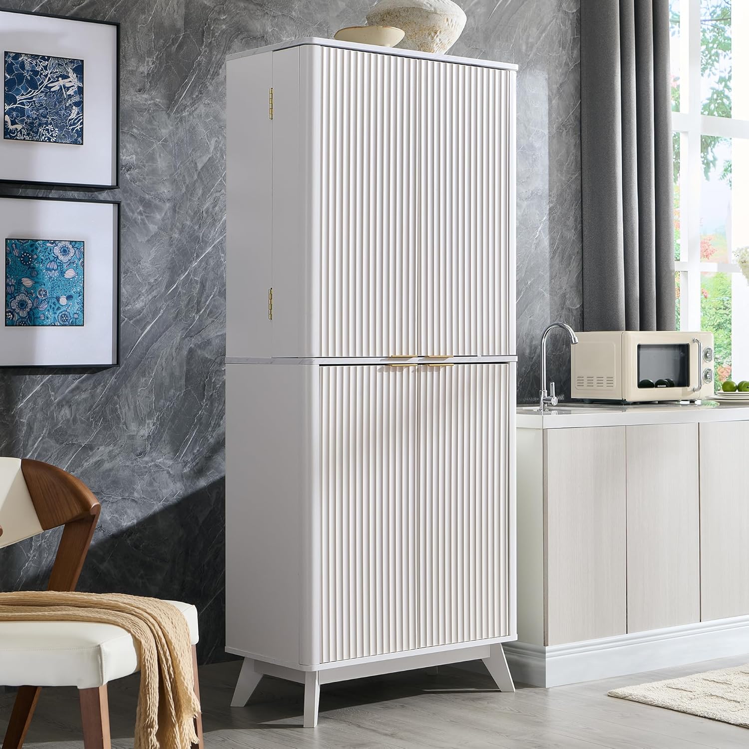 OKD Fluted Kitchen Pantry, 72" Tall Mid Century Modern Storage Cabinet with Adjustable Shelves & Door Organizer, Wood Cabinet for Kitchen, Living Room, Solid White