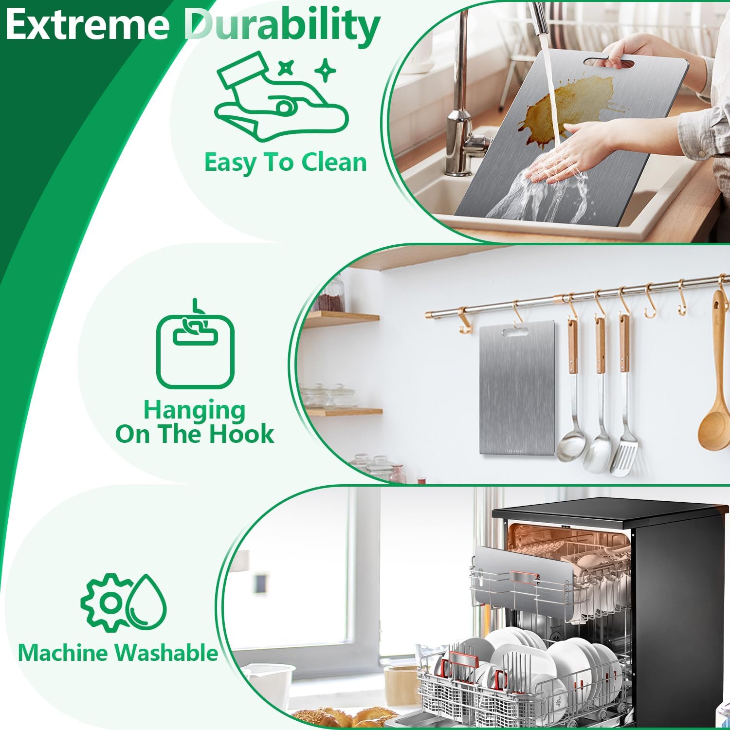 - ăEffortless Cleaning & Maintenanceă No oiling or soaking needed!Simply rinse with clear water.Dishwasher-safe (top rack recommended) for ultimate convenience.Food-grade titanium cutting boards are safe,do not release any crumbs,creating a healthy cooking environment.Titanium cutting board is the innovative choice of high-end kitchen tools,can be used for a lifetime.