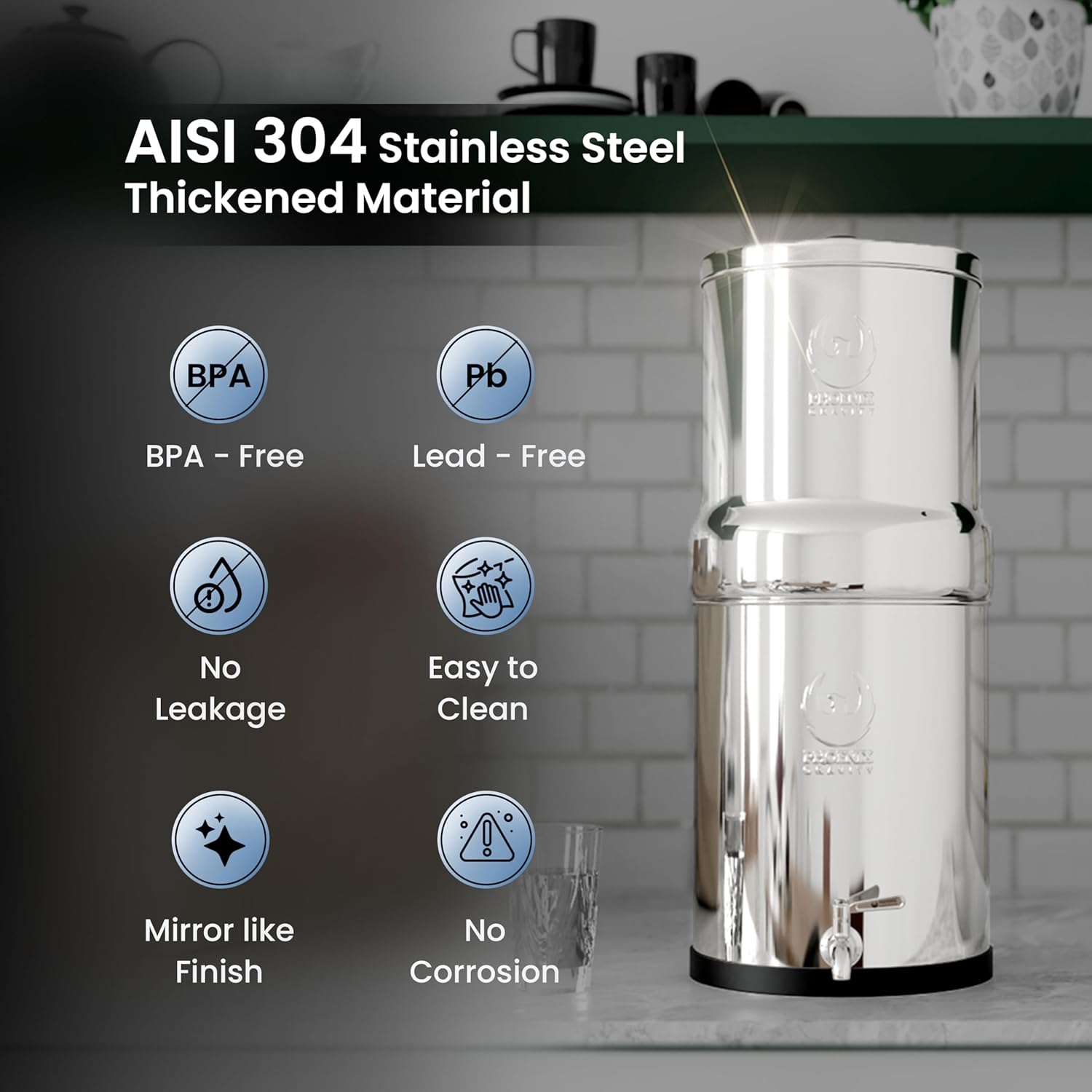 Gravity Water Filter System - 1.5 Gallons NSF Certified AISI 304 Stainless Steel Water Filter with 2 Smart (Black) Carbon Filter Elements & Free Stainless Steel Stand and Spigot (1.5G)