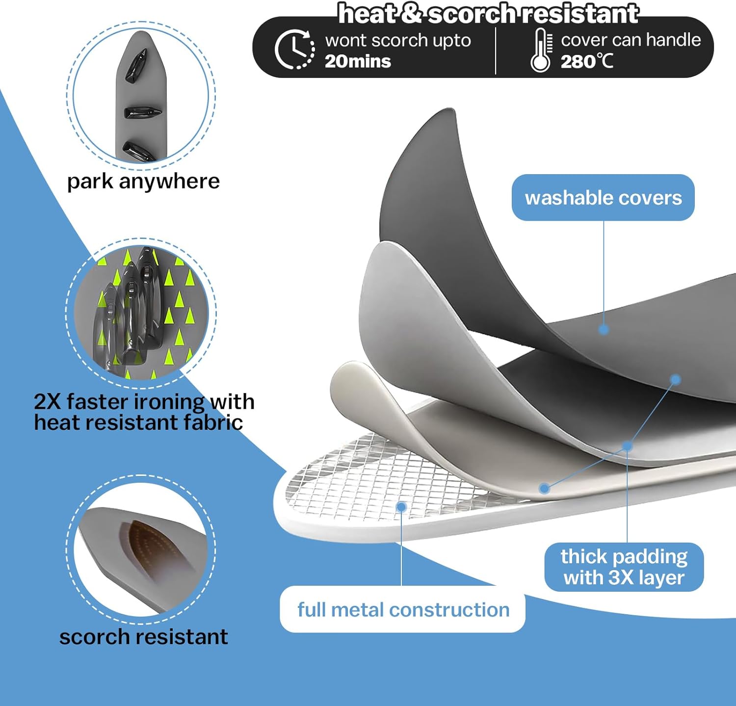 - 【Compact & Portable Design】Our small ironing board tabletop is perfect for small spaces, measuring 32×12×6 inches when open and folding down to just 16×12×2 inches. The included iron holder adds convenience, making it ideal for apartments, dorms, or travel.