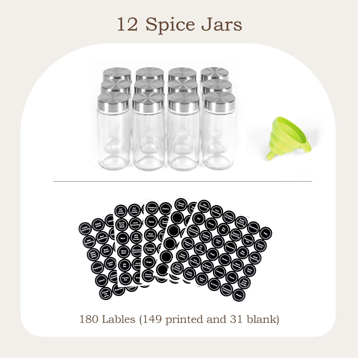 - 【All-Inclusive Set】Includes 12 airtight glass jars, funnel, 180 lables(149 printed and 31 blank), functional kitchen spice organizer.