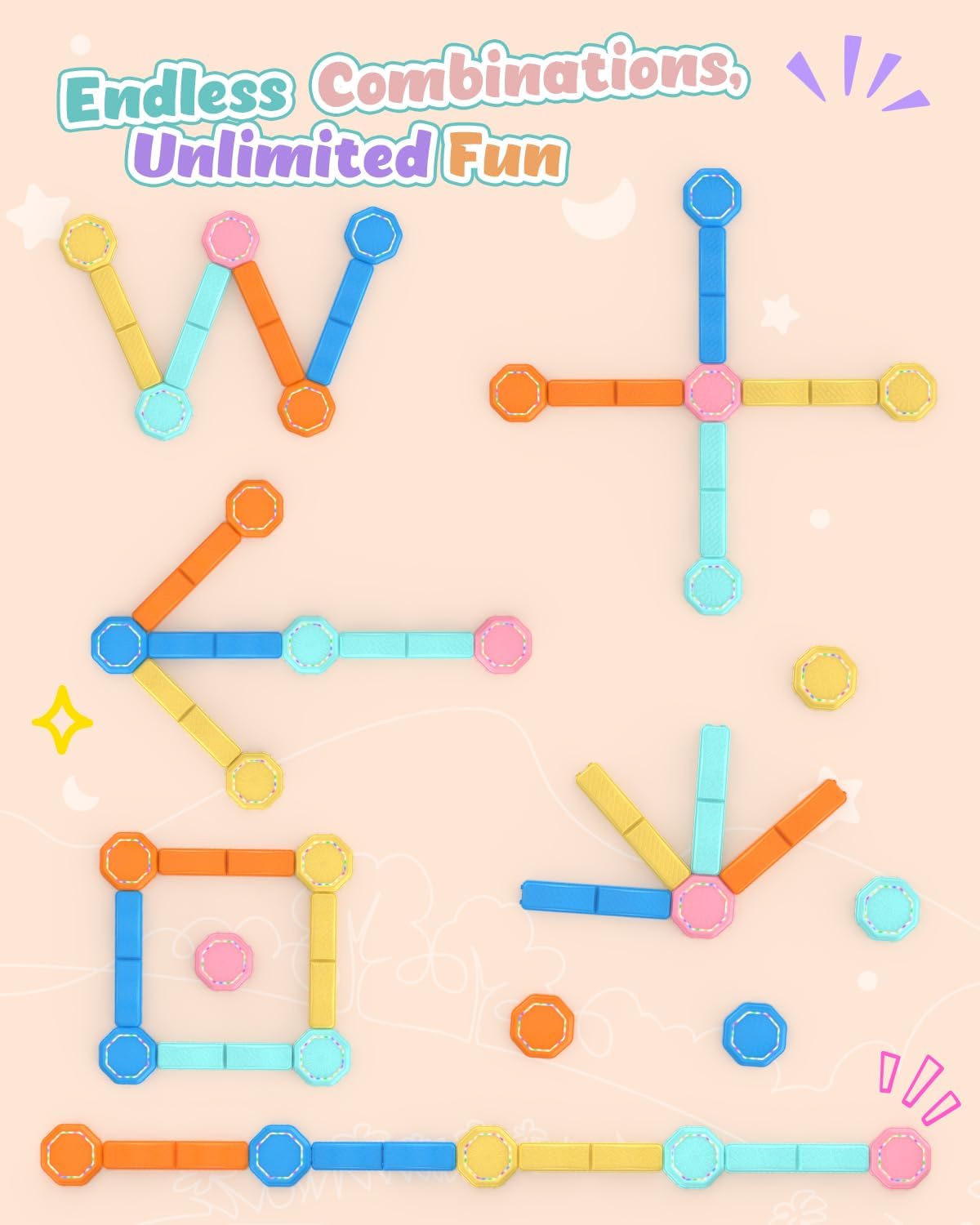 - Modular Balance Path – Endless Configurations:This set includes 8 connectable beams and 5 sensory stepping stones for toddlers 1-3 and up. Kids can build their own unique obstacle courses—straight lines, zig-zags, or loops—to challenge their balance and spark creativity.