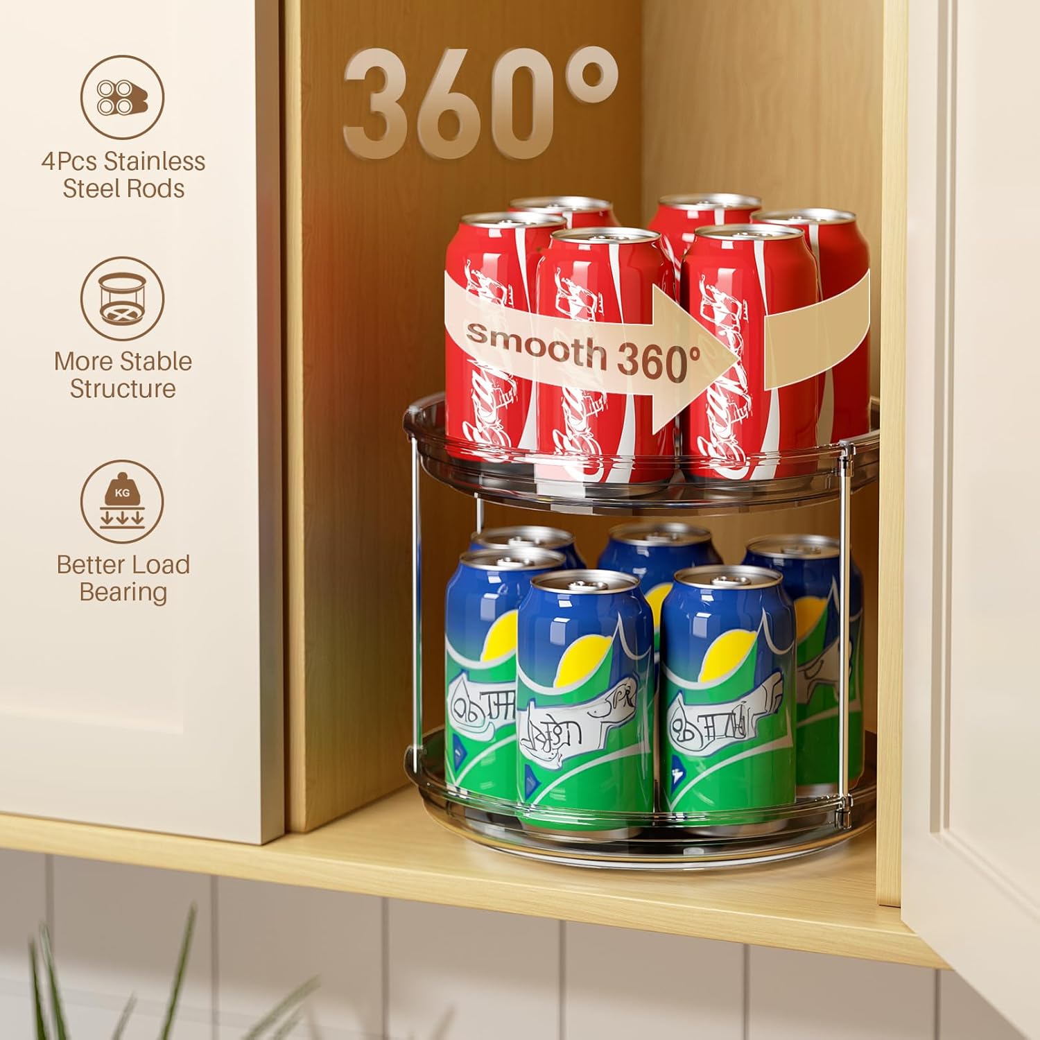 - ENHANCED METAL RODS: Unlike other flimsy plastic spinning seasoning organizers, our lazy susan turntable for cabinet uses metal rods to connect the two tiers for a sturdy construction that ensures stability even when loaded with heavy jars