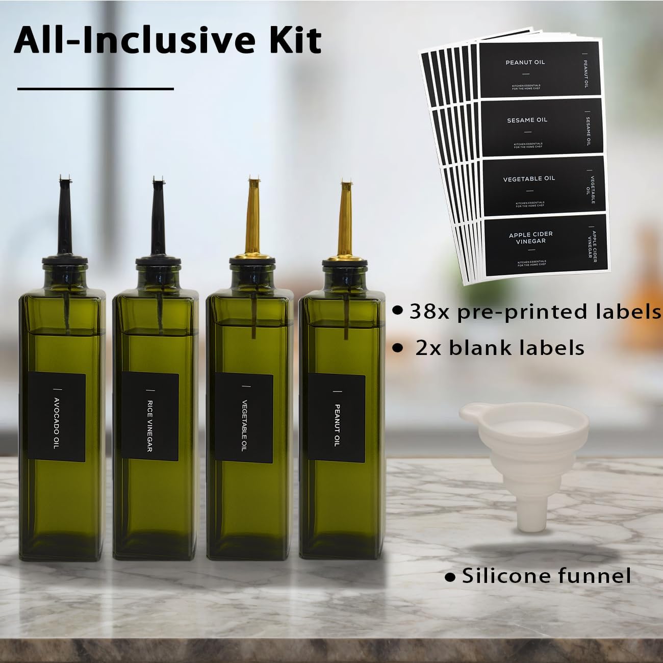 - Complete Gourmet Gift Set - Ready to Impress: Everything included for the food lover! This olive oil dispenser set includes four 16.9oz glass bottles (perfect for olive oil and vinegar), drip-free spouts, and labels. Gift-ready as a glass oil vinegar dispenser set, avocado oil dispenser for kitchen, or decorative oil dispensers for kitchen. Sophistication meets practicality β the ideal oil and vinegar dispenser set or cruets for vinegar and oil.