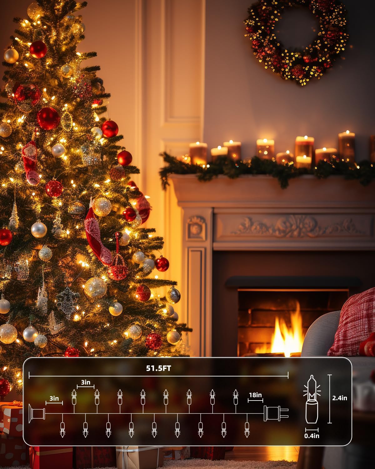 - 【Festive Mini Christmas Lights Set】This set includes 200 transparent incandescent mini-lights on 51.5 ft white wire, with bulbs spaced 3-inche apart and 18-inch lead wire. Perfect for holiday decorating, with the ability to connect up to 2 light strings end-to-end;