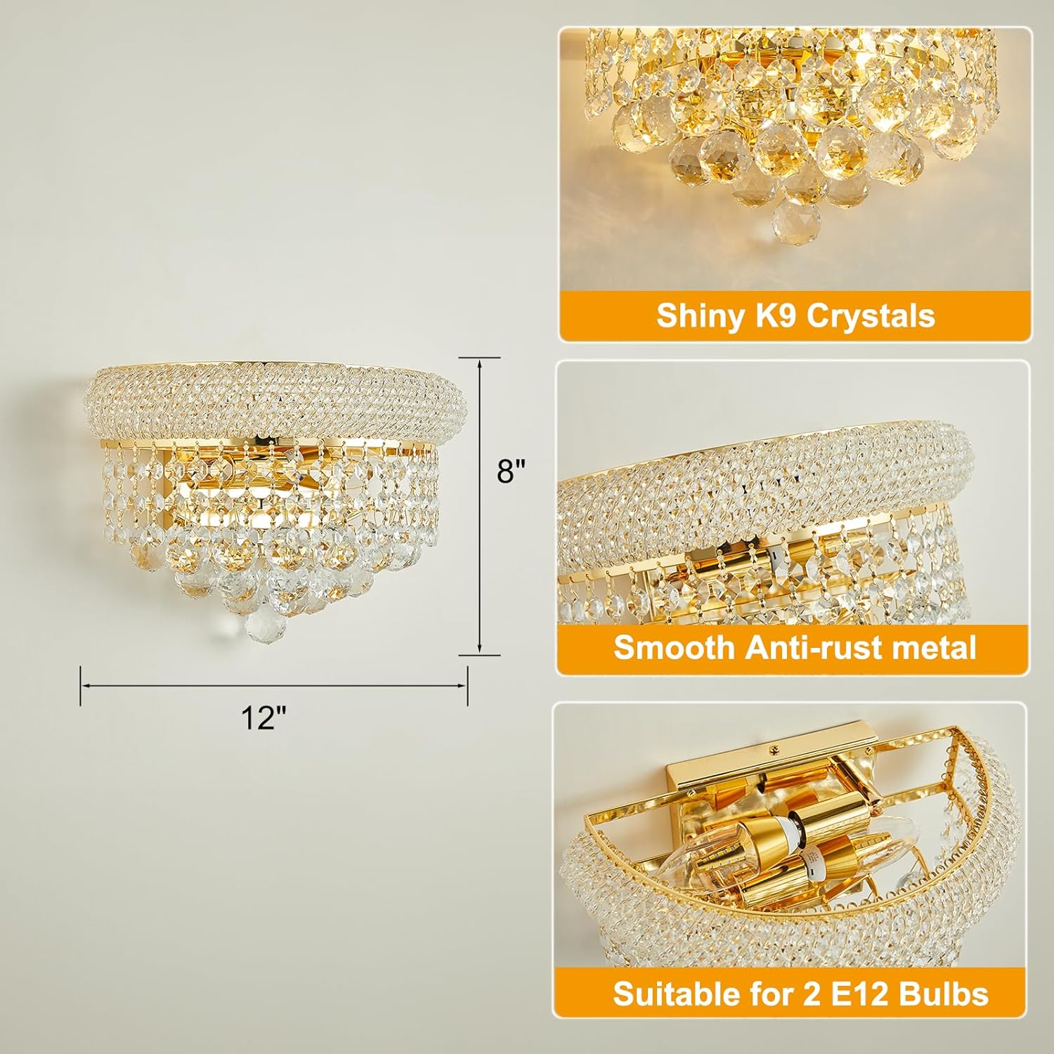 Empire Crystal Wall Sconces, Gold Wall Light Fixtures, Luxury Wall Lamp for Living Room Bedroom Bathroom Bedside Hallway Stairway