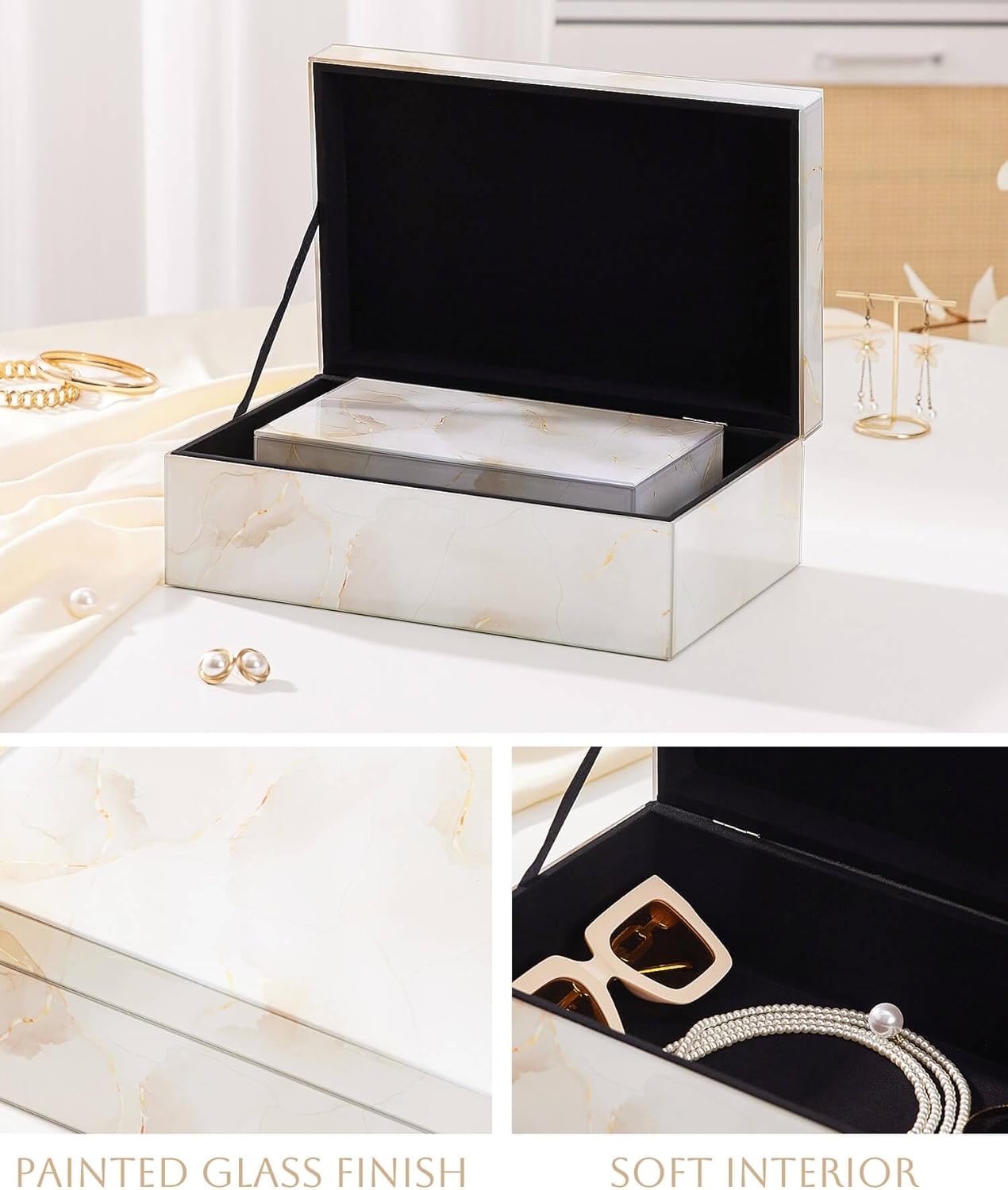 - Premium Quality Decorative Box Set: This set includes two beautifully crafted decorative boxes. The outer frames are made of luxury glass material, while the inner linings are soft velvet, ensuring durability and a luxurious feel. The large box measures 11.10Ă—7.44Ă—4.02 inches, and the small one is 8.35Ă—5.08Ă—2.83 inches. Ideal for storage, organization, or as a stylish keepsake, these boxes are a must-have for any home