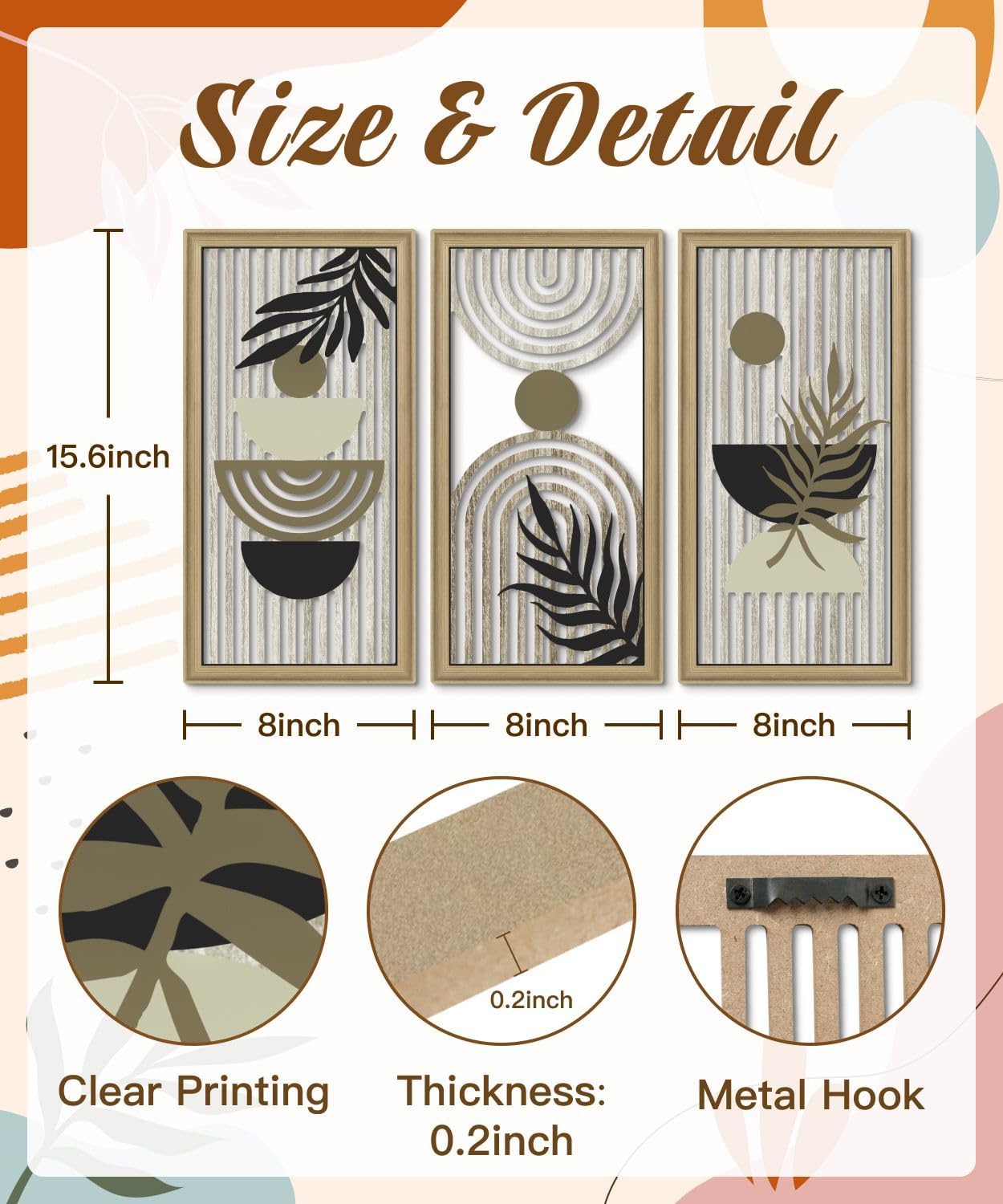- Neutral Boho Aesthetic: This set of 3 wall art pieces features a harmonious blend of geometric shapes, abstract leaves, and earthy tones like beige, black, and olive. A subtle and modern take on bohemian style that enhances any space.