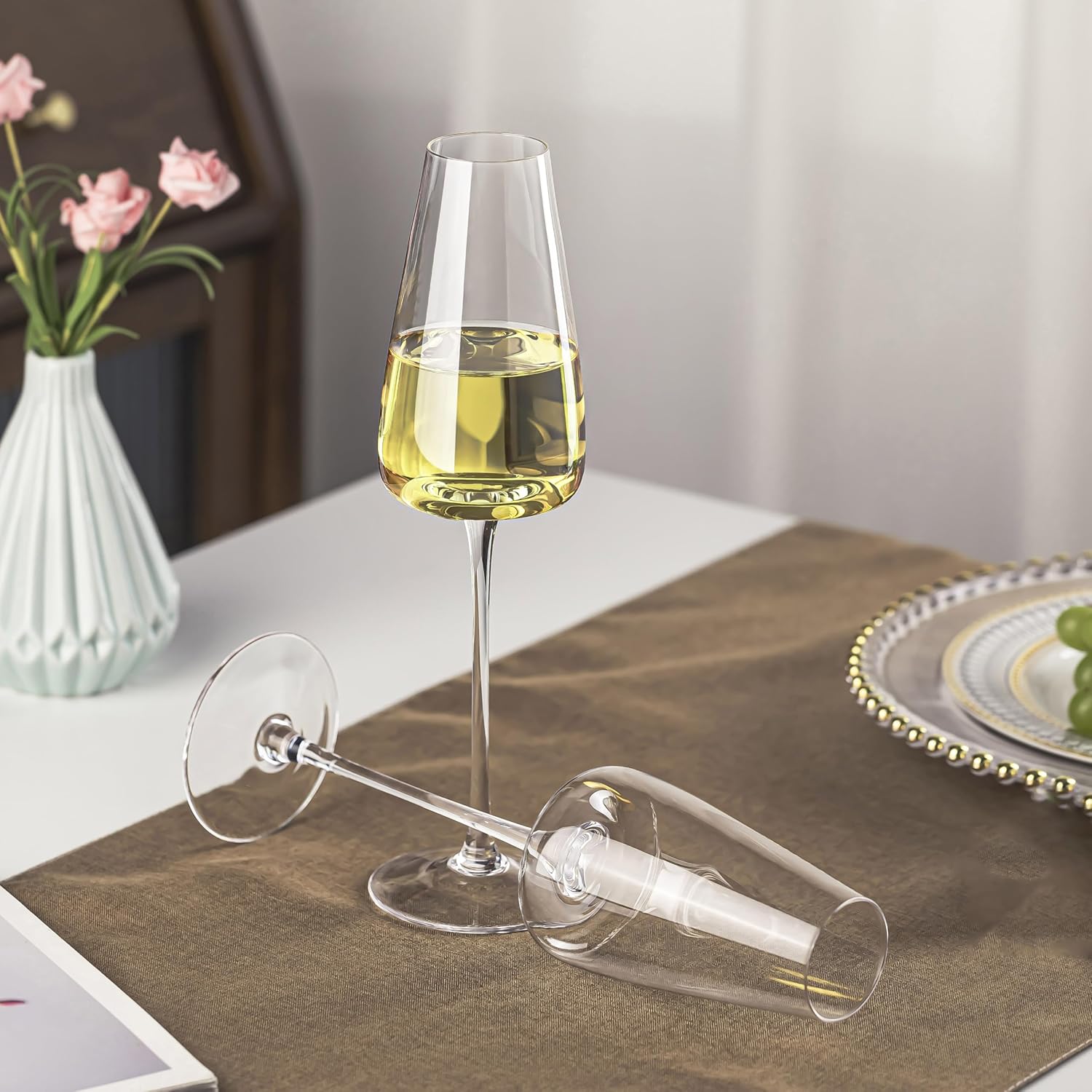 - EXCELLENT DESIGN: The concave design at the bottom of the champagne increases the contact area between the champagne and the air, fully releases the aroma of champagne. The stem of the champagne flutes is slim and tall, which shakes the glass more elegantly. The champagne glasses brings you a more professional experience.