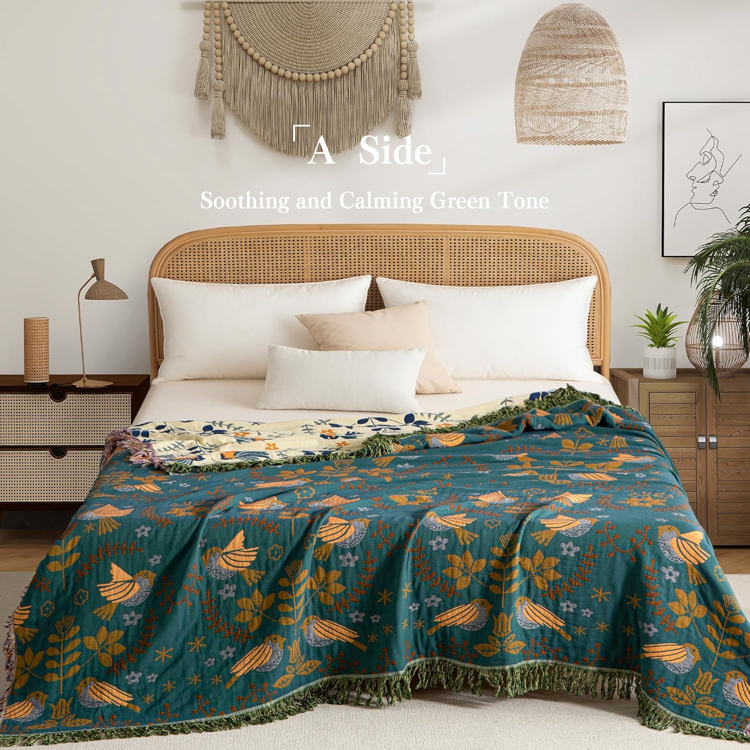 Boho Throw Blanket Queen Size, Oversized Soft Cozy Cotton Muslin Quilt Blanket for Bed Decor, Bird Patterned Couch Sofa Chair Cover, Vintage Farmhouse Cottage Woven Blanket, Green&Beige