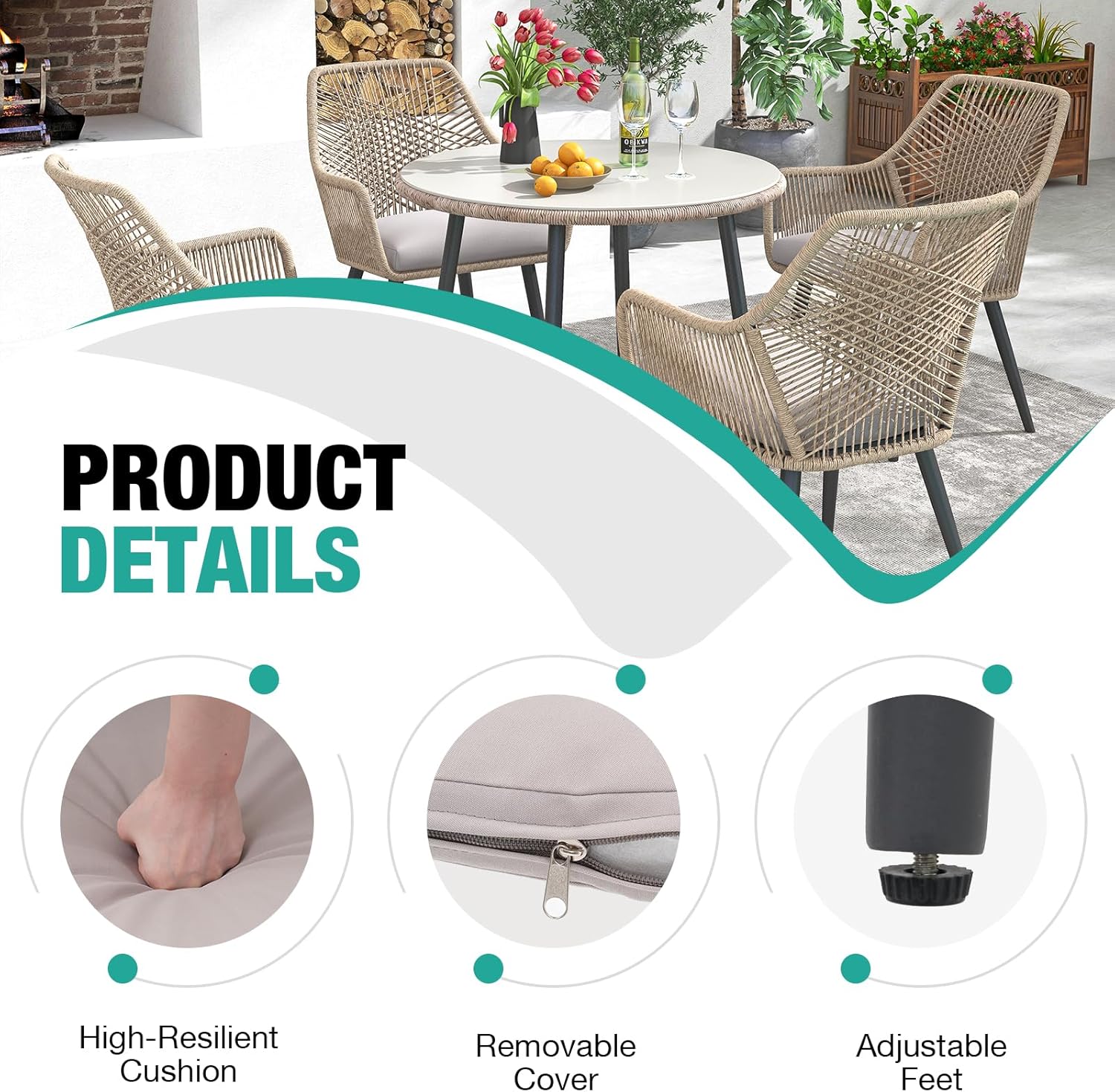 - 🍴【Premium Material & Stylish Twisted Rattan】: This twisted rattan patio dining chair is crafted with high-quality PE rattan and a sturdy powder-coated steel frame, ensuring durability and weather resistance. The chair's tapered legs with adjustable feet complement its overall design beautifully.