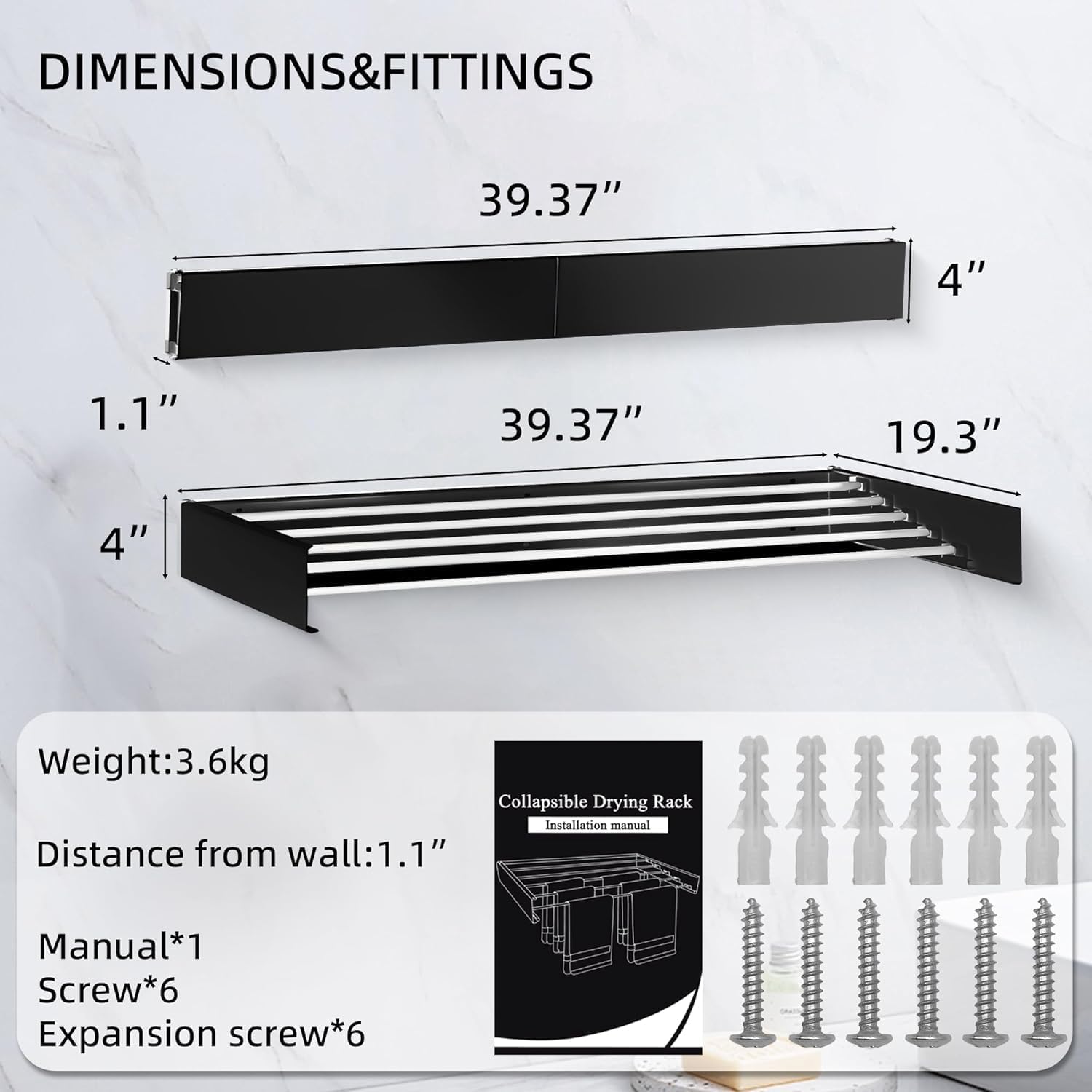 Laundry Drying Rack Collapsible, Wall Mounted Clothes Drying Rack. 39.37" Wide, 19.3 Linear Ft, 5 Aluminum Rods, with Wall Template, Screwdriver Bit (Black 1M)